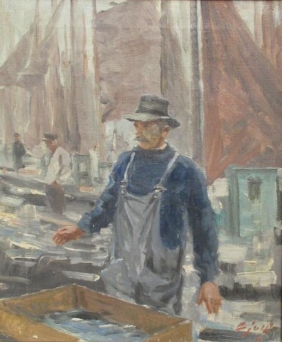 Bjulf, SC (1890 - 1958) Dänemark: Ein Fischhändler, Kopenhagen. Öl auf Leinwand. Signiert: Bjulf. 38 x 28 cm.