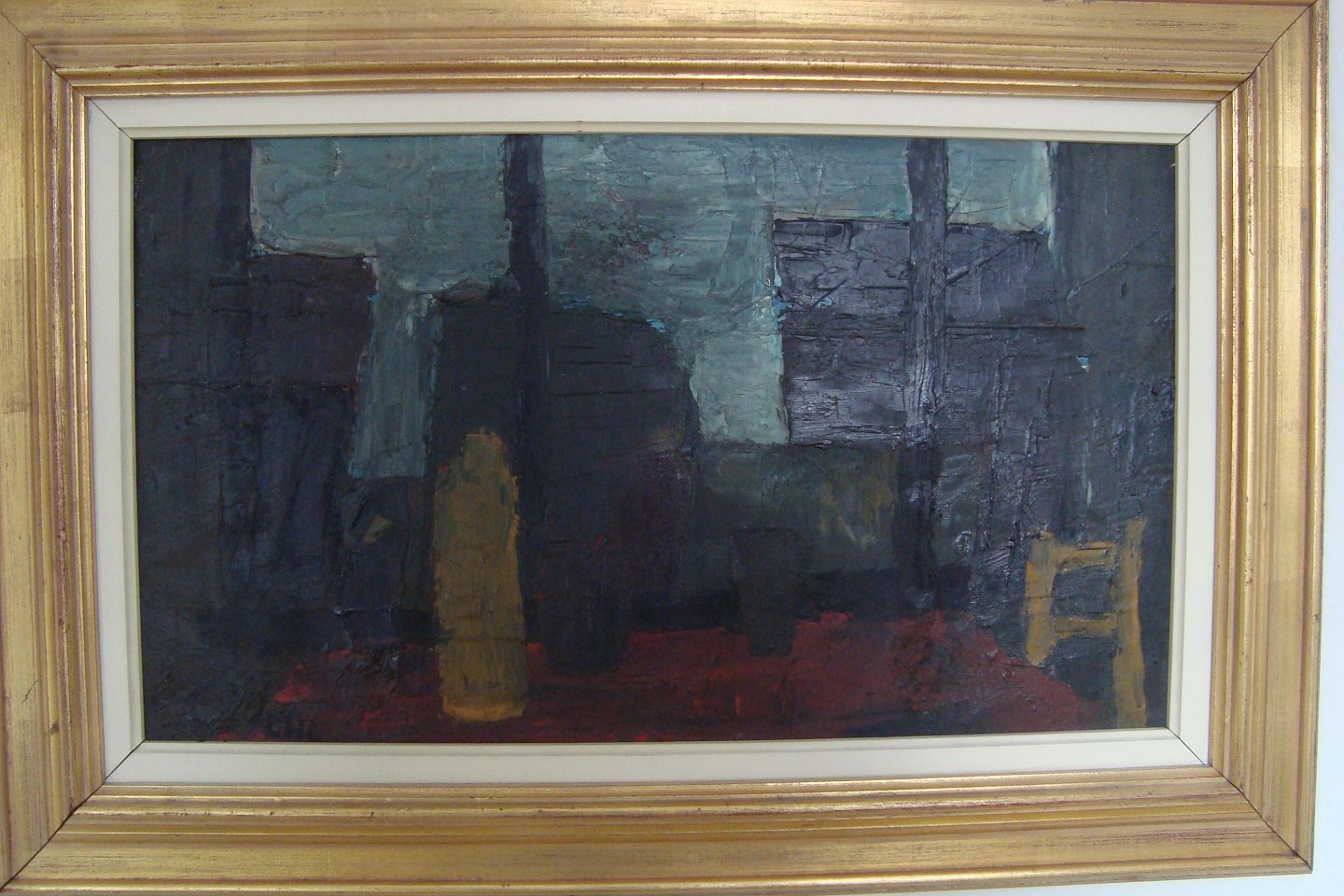 Maleri - Leif Lemmiche - Interiør ved vindue med bord og stol.