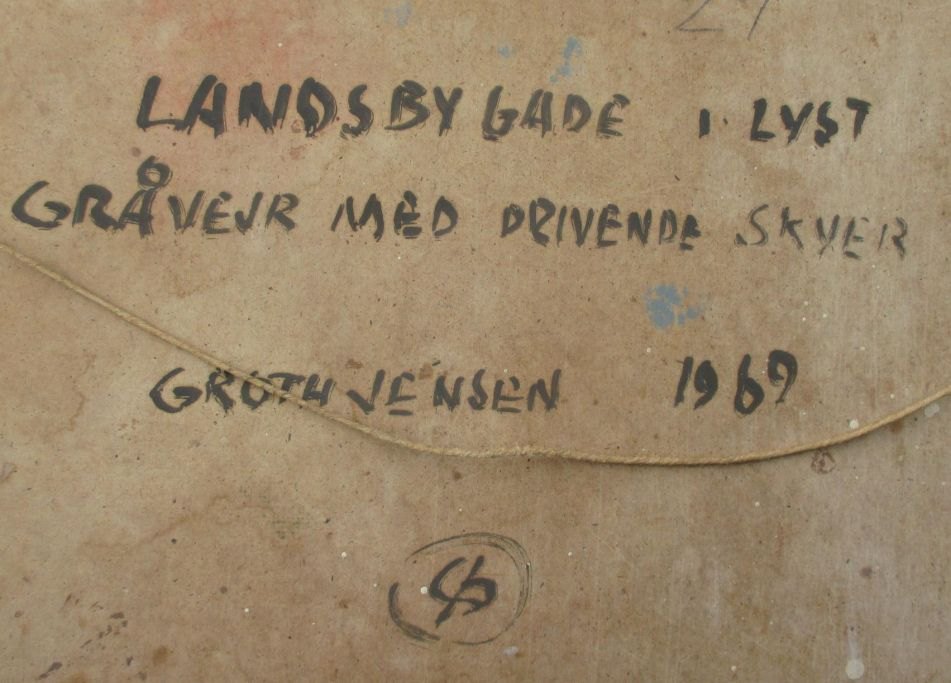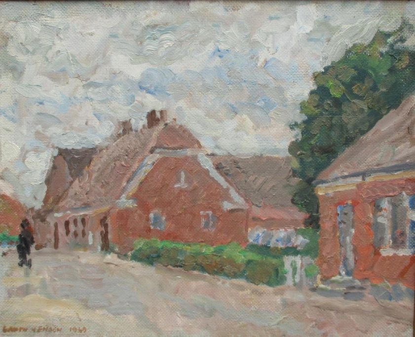 Groth-Jensen, Jens Peter (1918 - ) Denmark: Village Street in Bright overcast with clouds drifting.