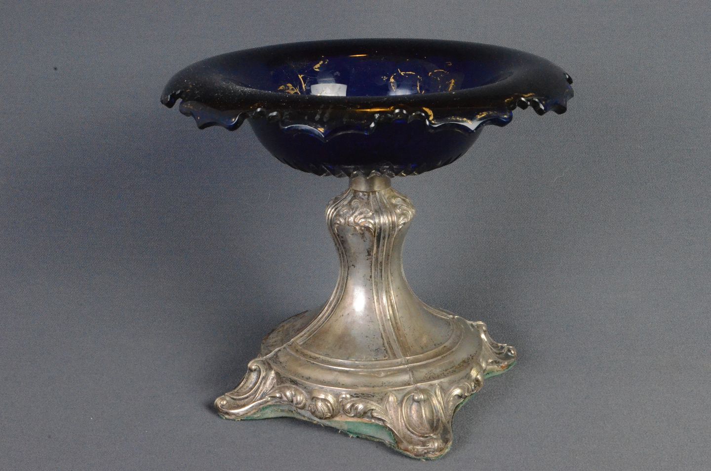 Opsats med blåt glas på sølvpletfod, gulddekoration slidt, h: 18 cm