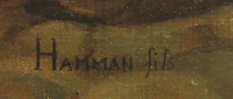Hamman, Edouard Michel Ferdinand (1850 -) France: Horses at the water trough. Oil on canvas. Signed .: Hamman fils. 32 x 41 cm.