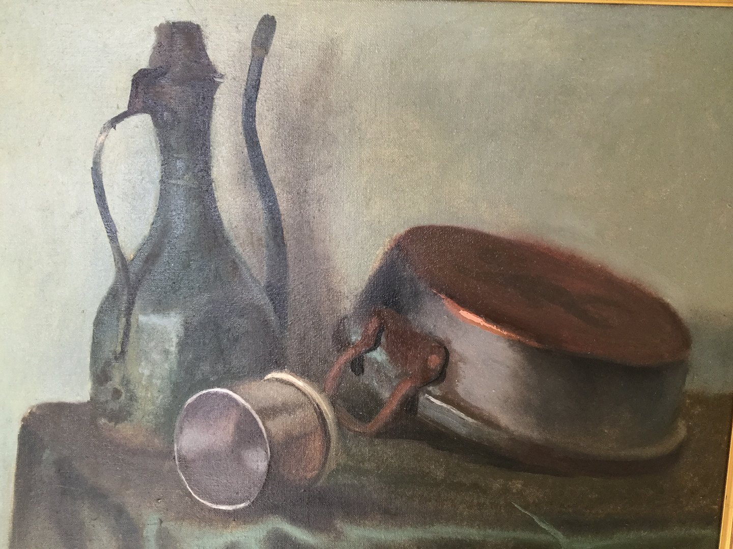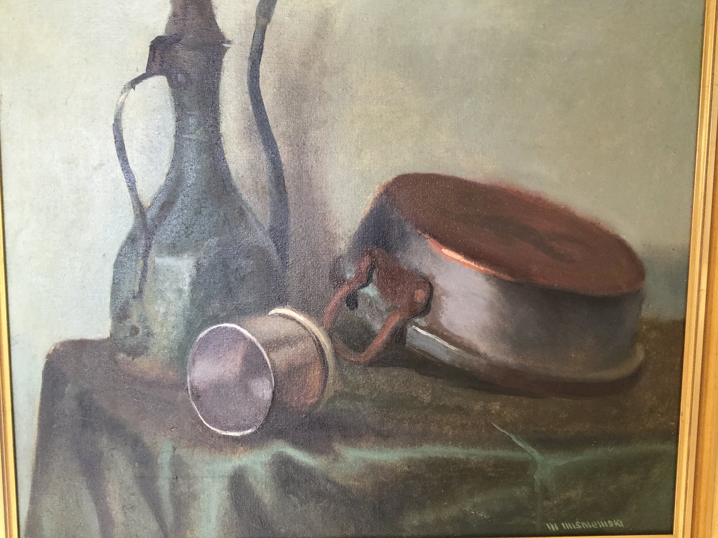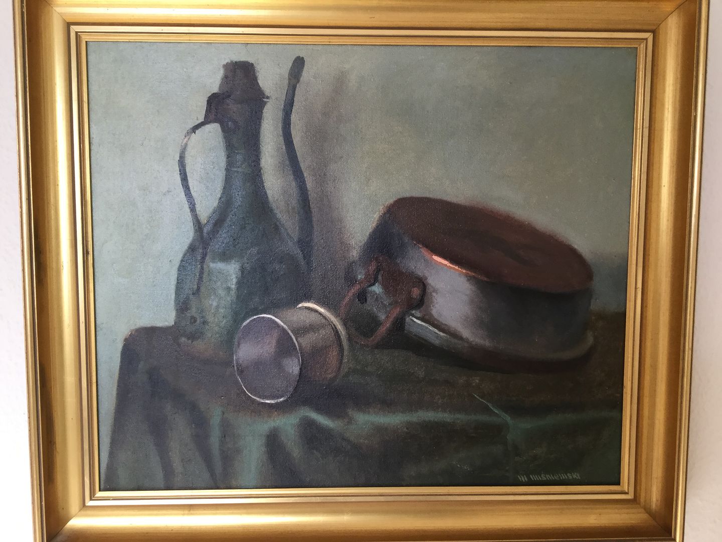 Text available in Danish: Maleri af Witold Wisniewski - Opstilling på bord med kobbertøj.