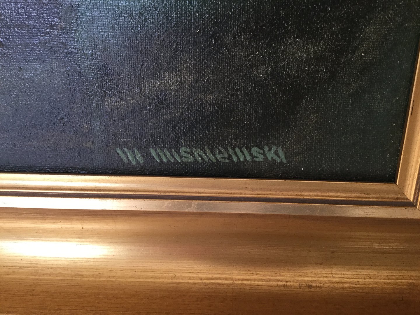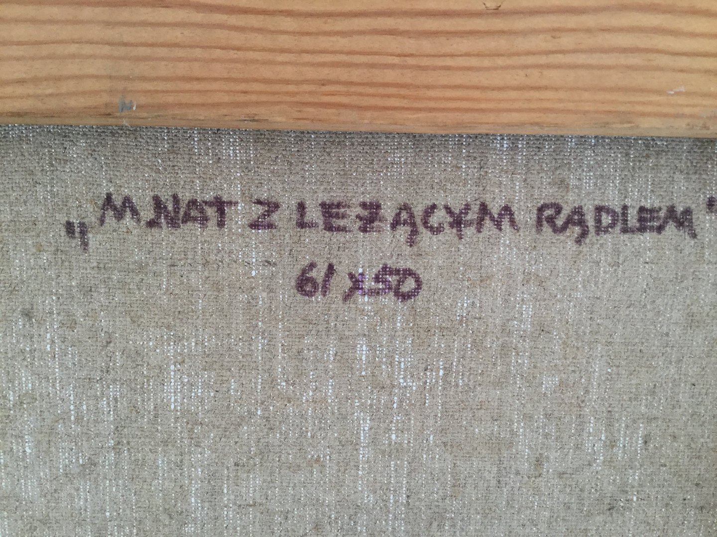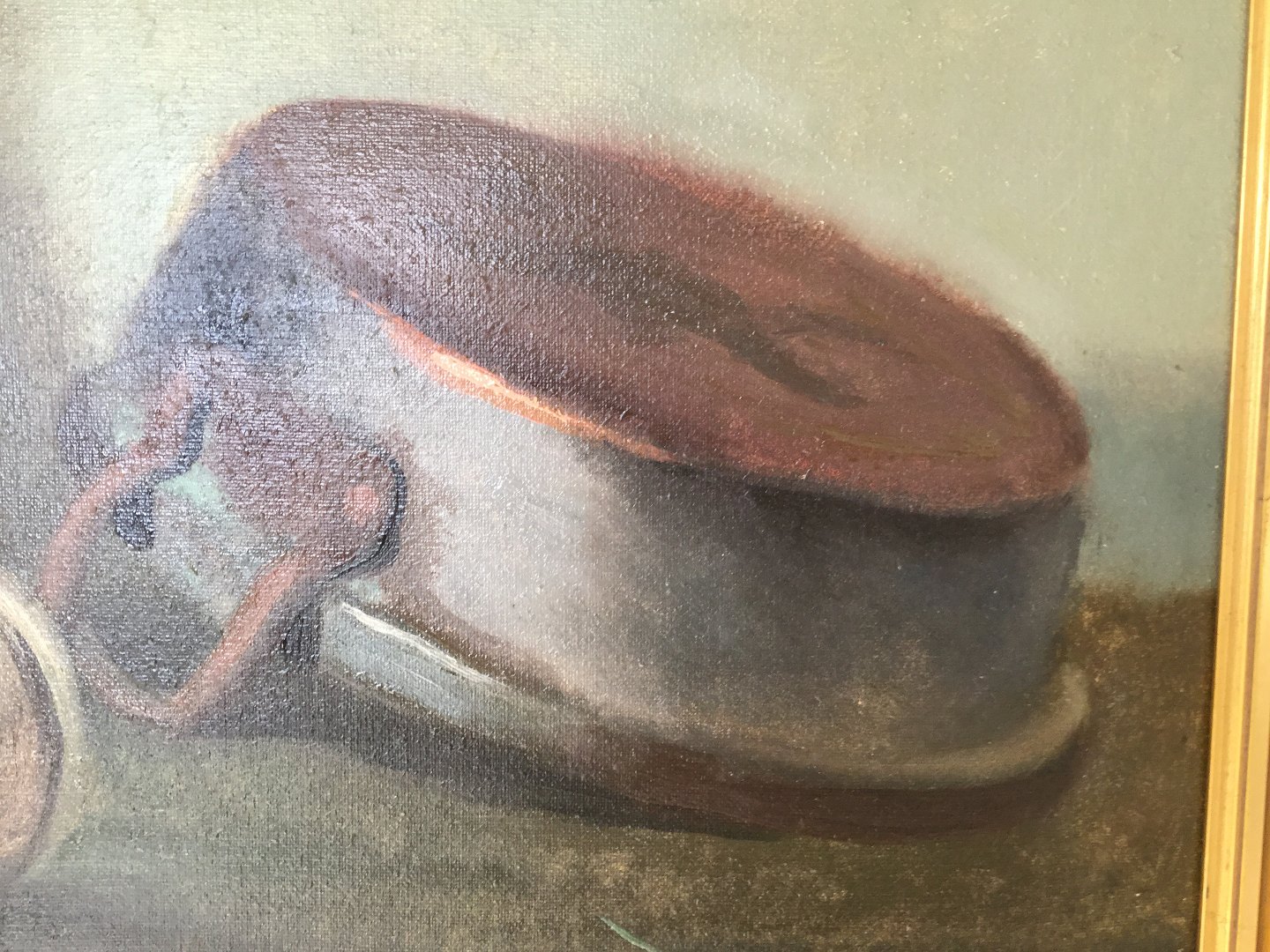 Text available in Danish: Maleri af Witold Wisniewski - Opstilling på bord med kobbertøj.