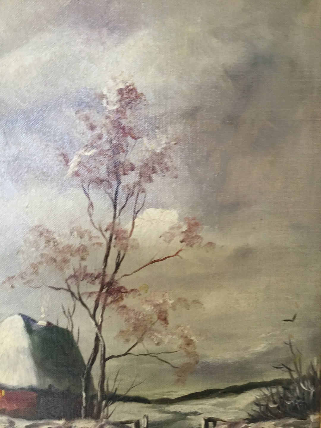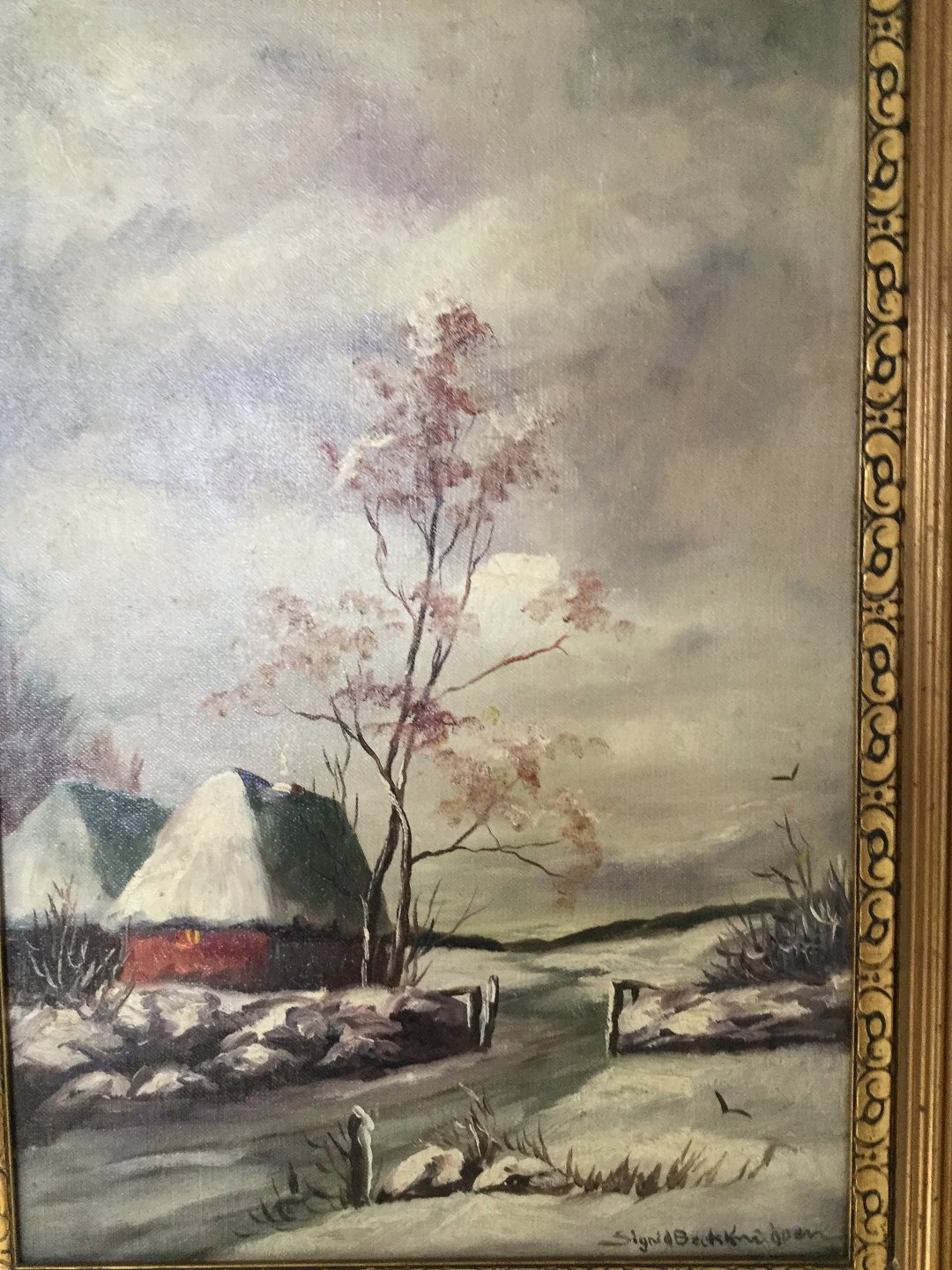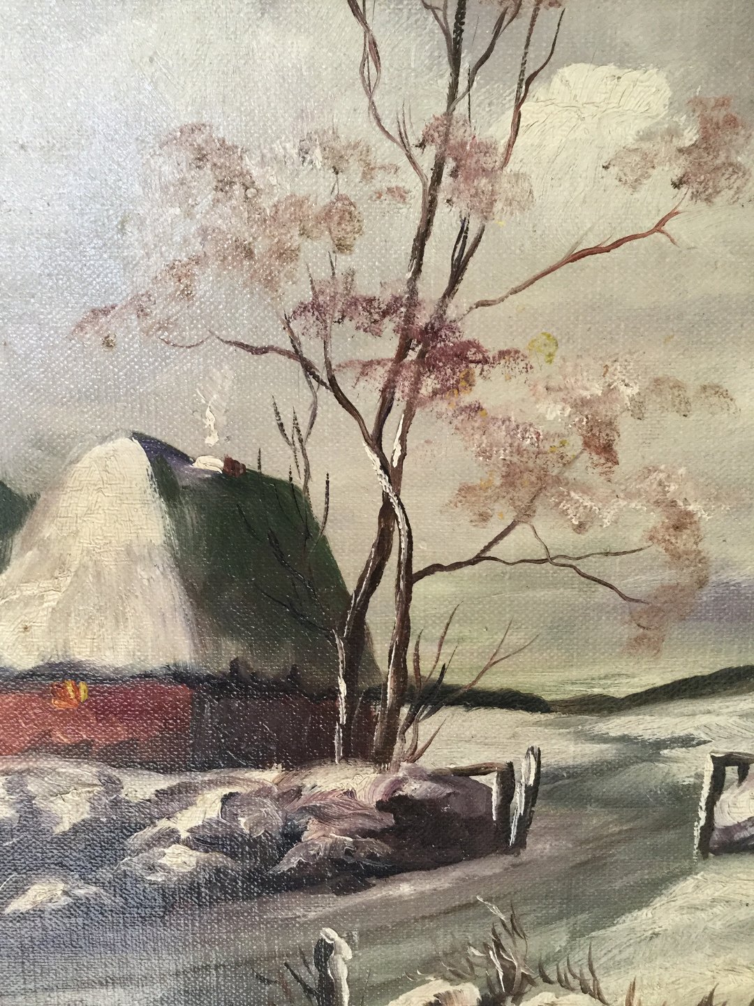 Maleri af Sigrid Bech-Knudsen - Vinterparti med huse ved vej.