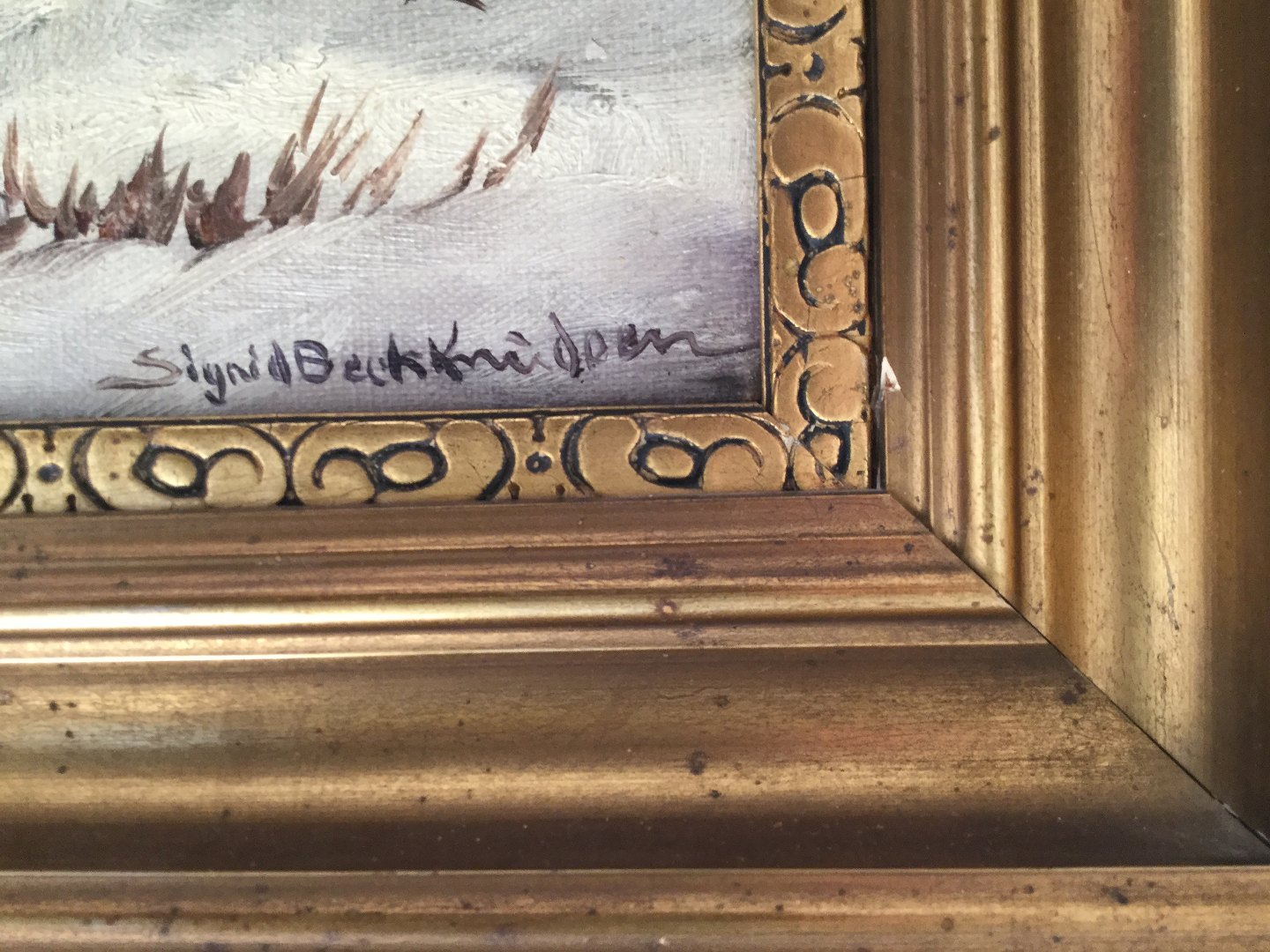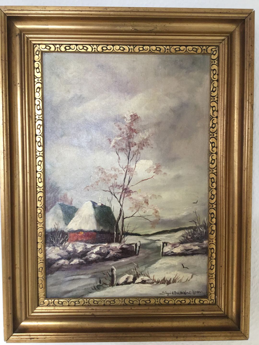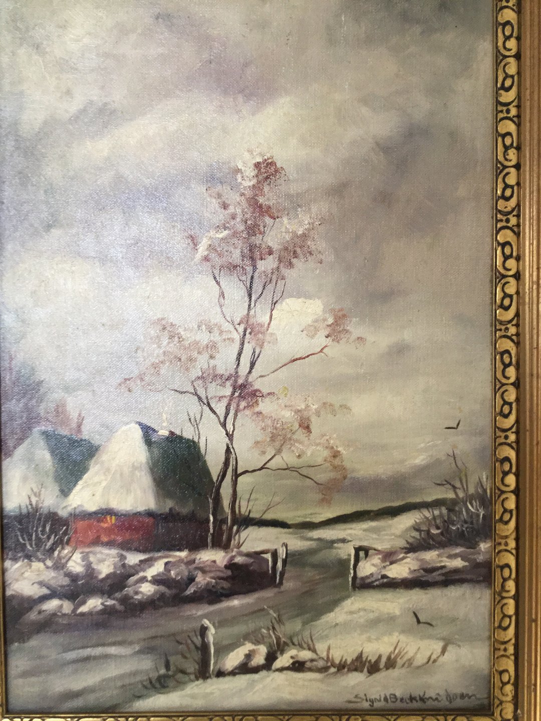 Maleri af Sigrid Bech-Knudsen - Vinterparti med huse ved vej.