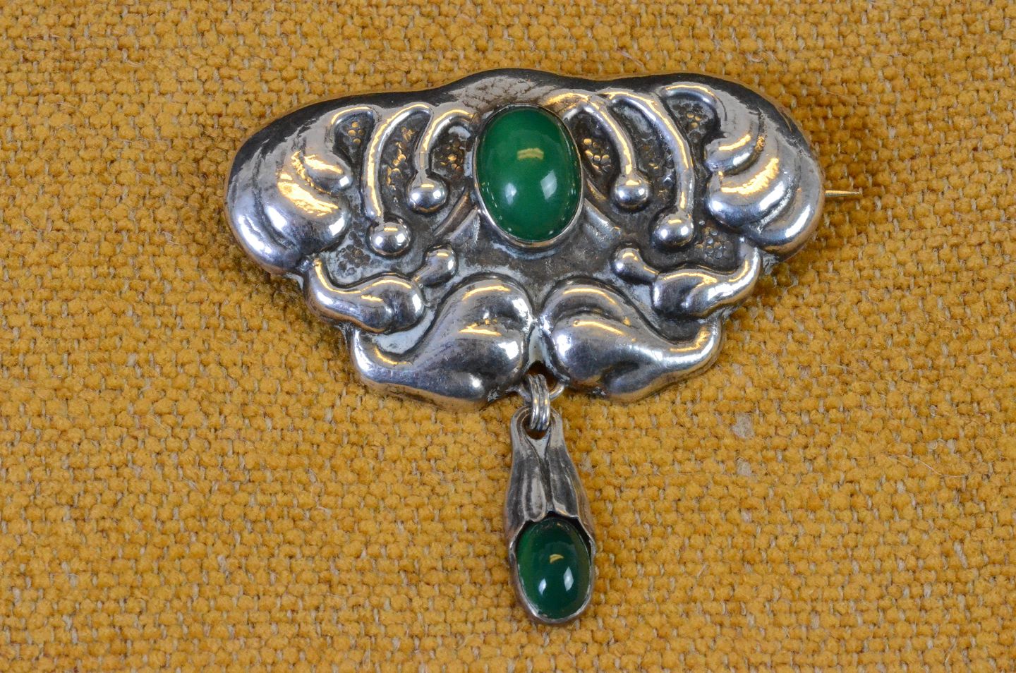Broche skønvirke, Jugend, Art Nouveau af organisk mønster i sølv med perle af grøn agat i centrum af broche og på spidsen af vedhæng. Stemplet 830. Art No. 4