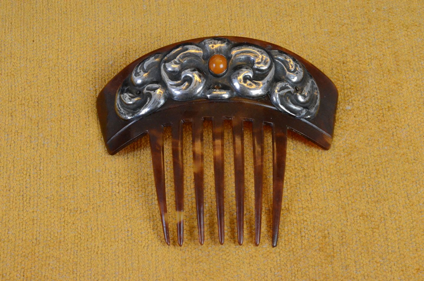 Hårkam skønvirke, skildpadde og sølv prydet med cabochonsleben rav 20. årh.s begyndelse. Stemplet 830S og utydeligt mærke. Str.: 13 * 4 cm, kam 11 cm. Art. No. 104