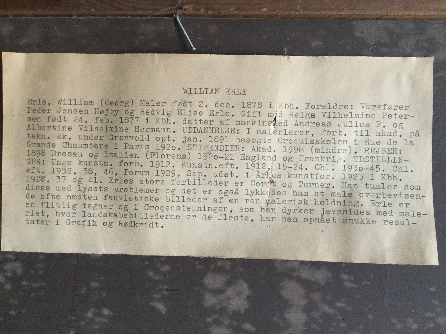 William Erle er uddannet fra teknisk skole i København ved Holger Grønvold, derefter på Kunstakademiet samme sted 1891-93, på kunstskole i Dresden 1898 og i Rue de la Grande Chaumiére, Paris 1920.