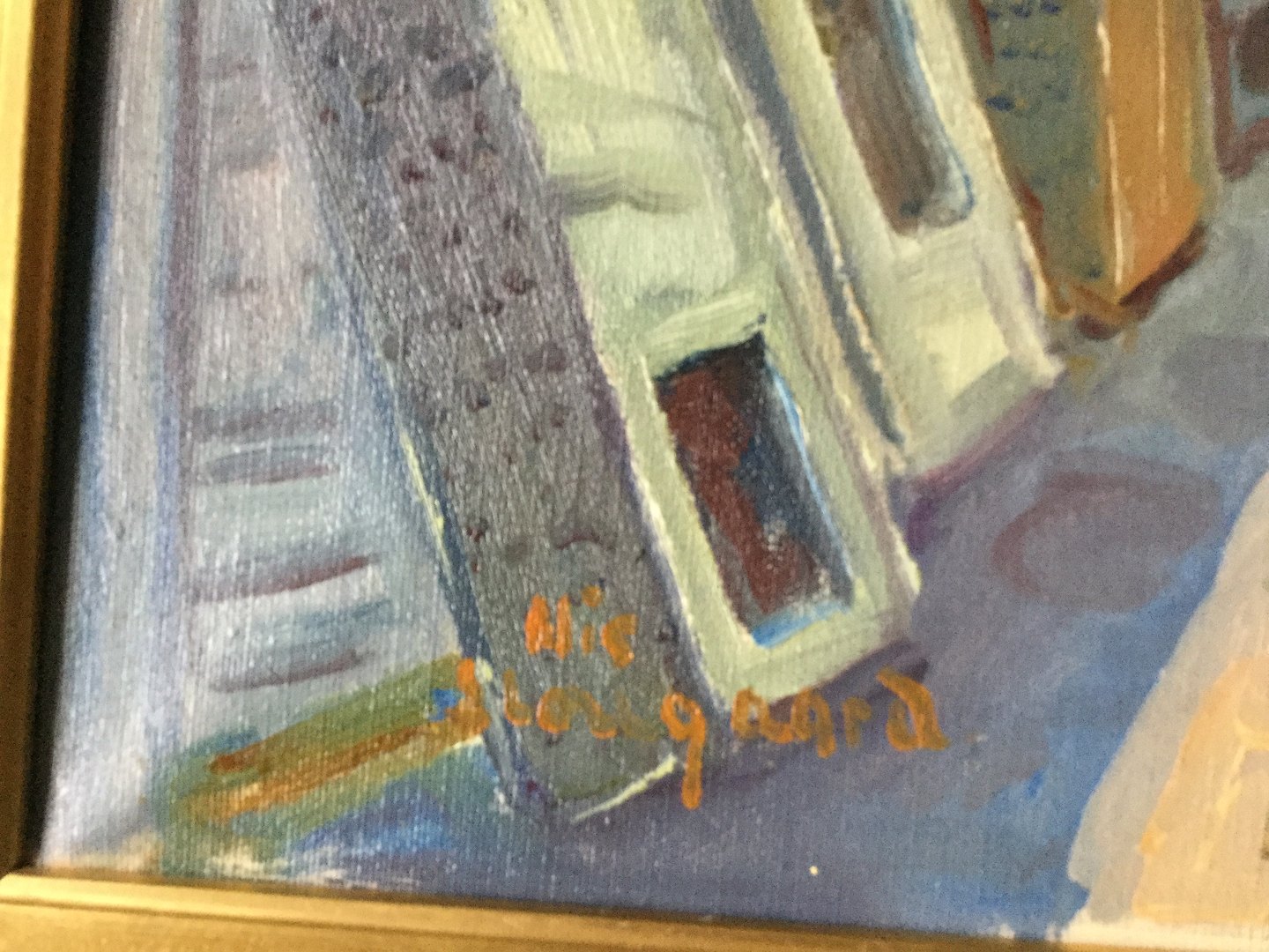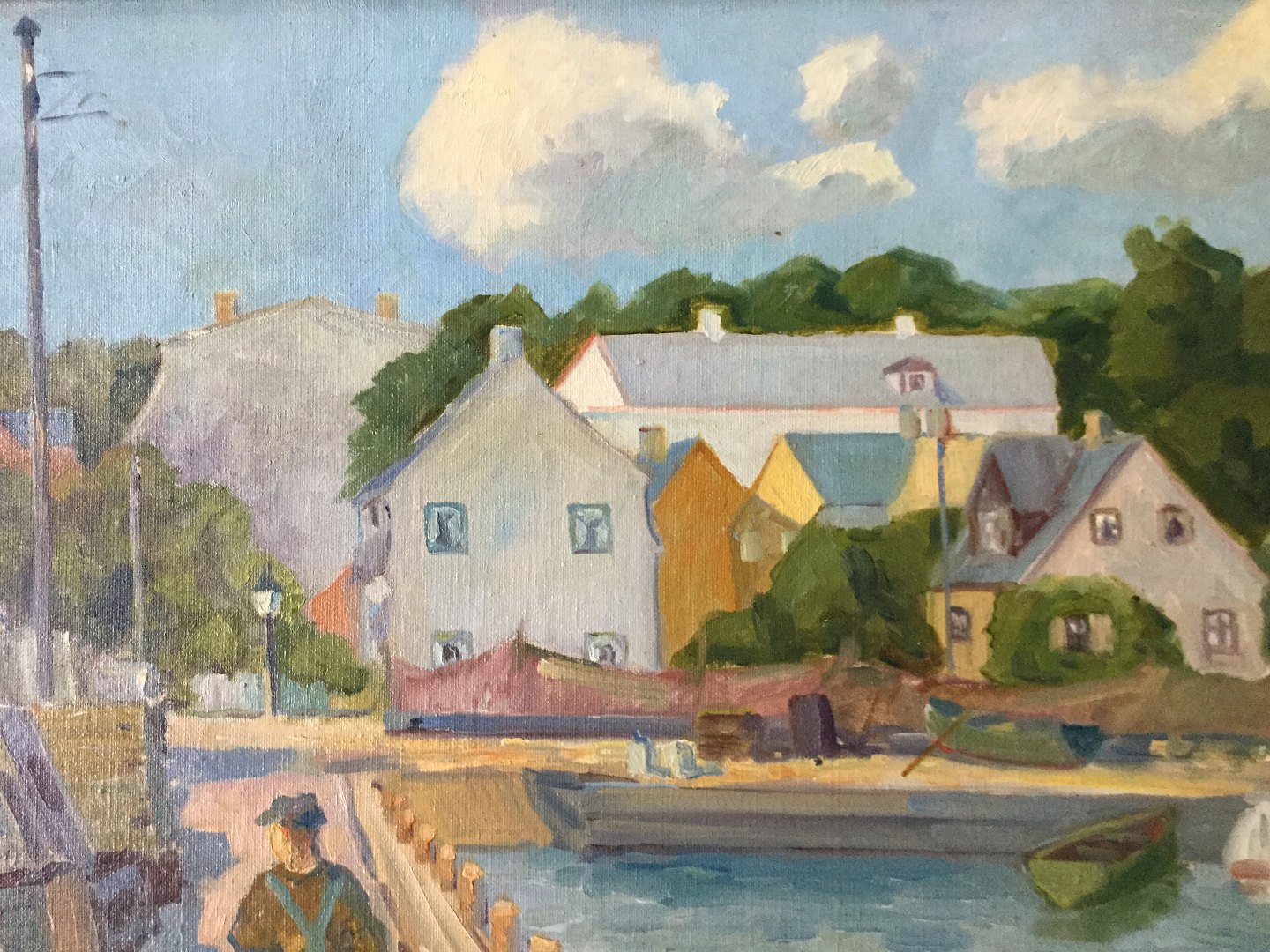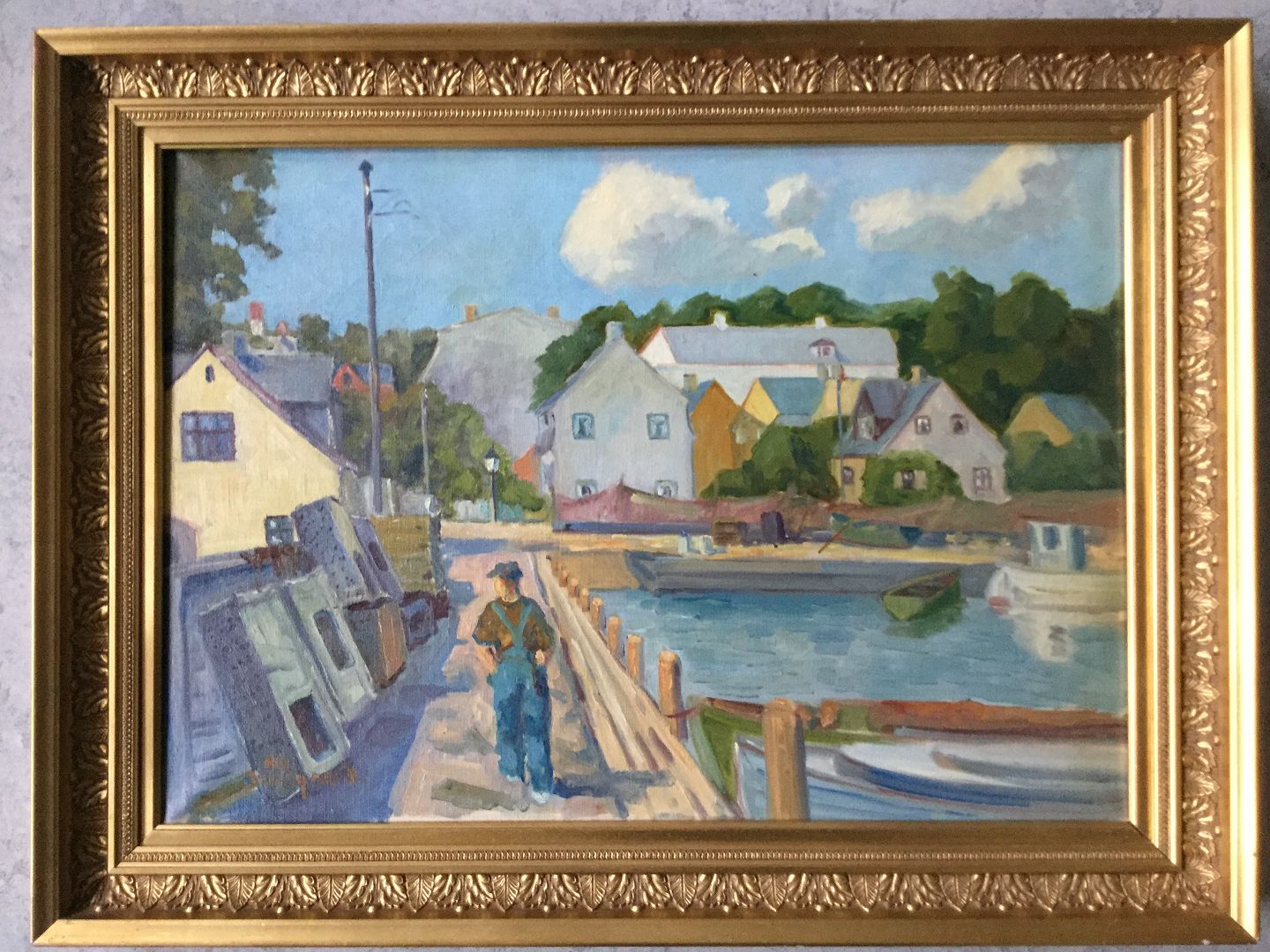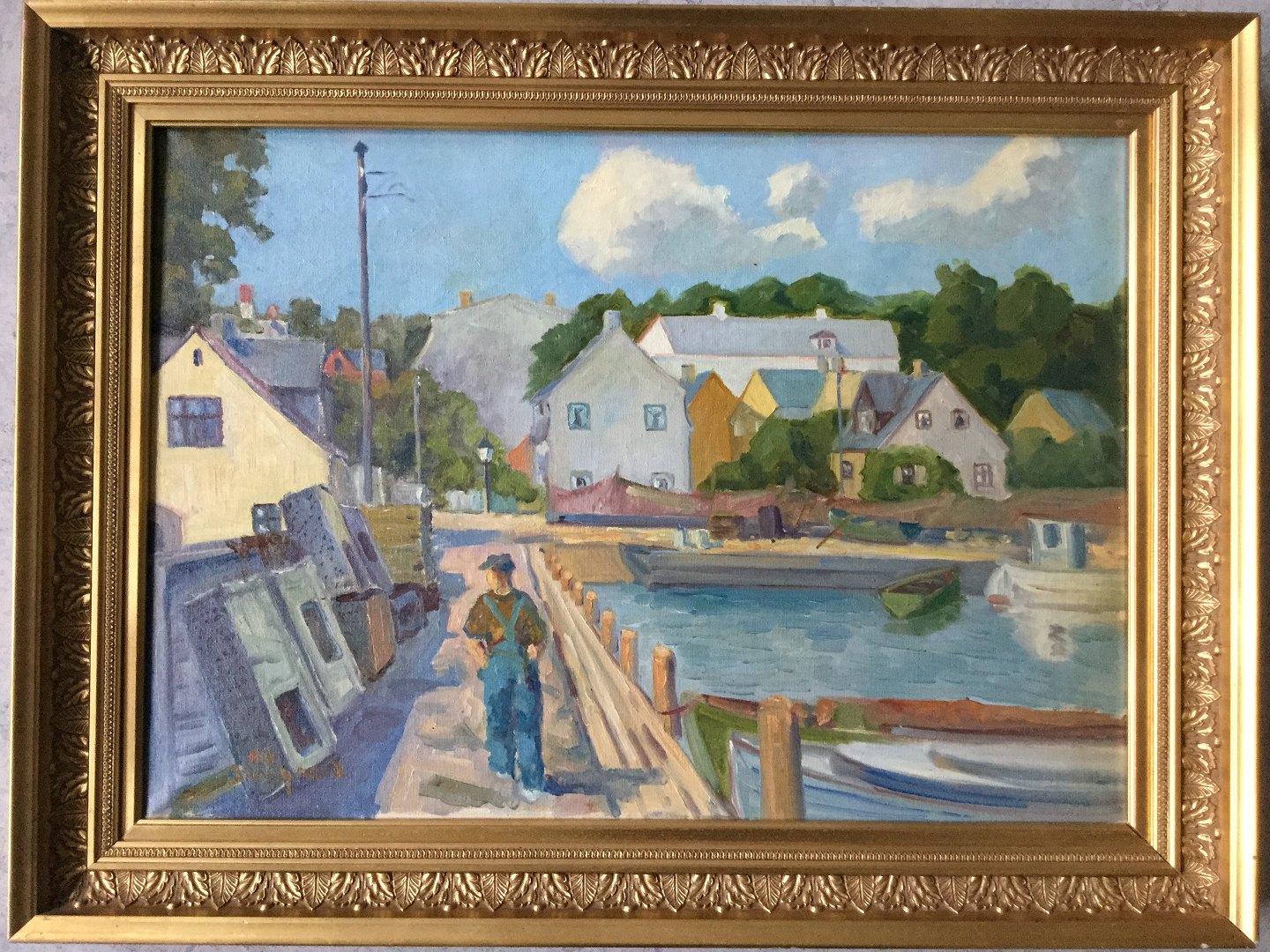 Maleri af Nis Stougaard - Havneparti, Bornholm.