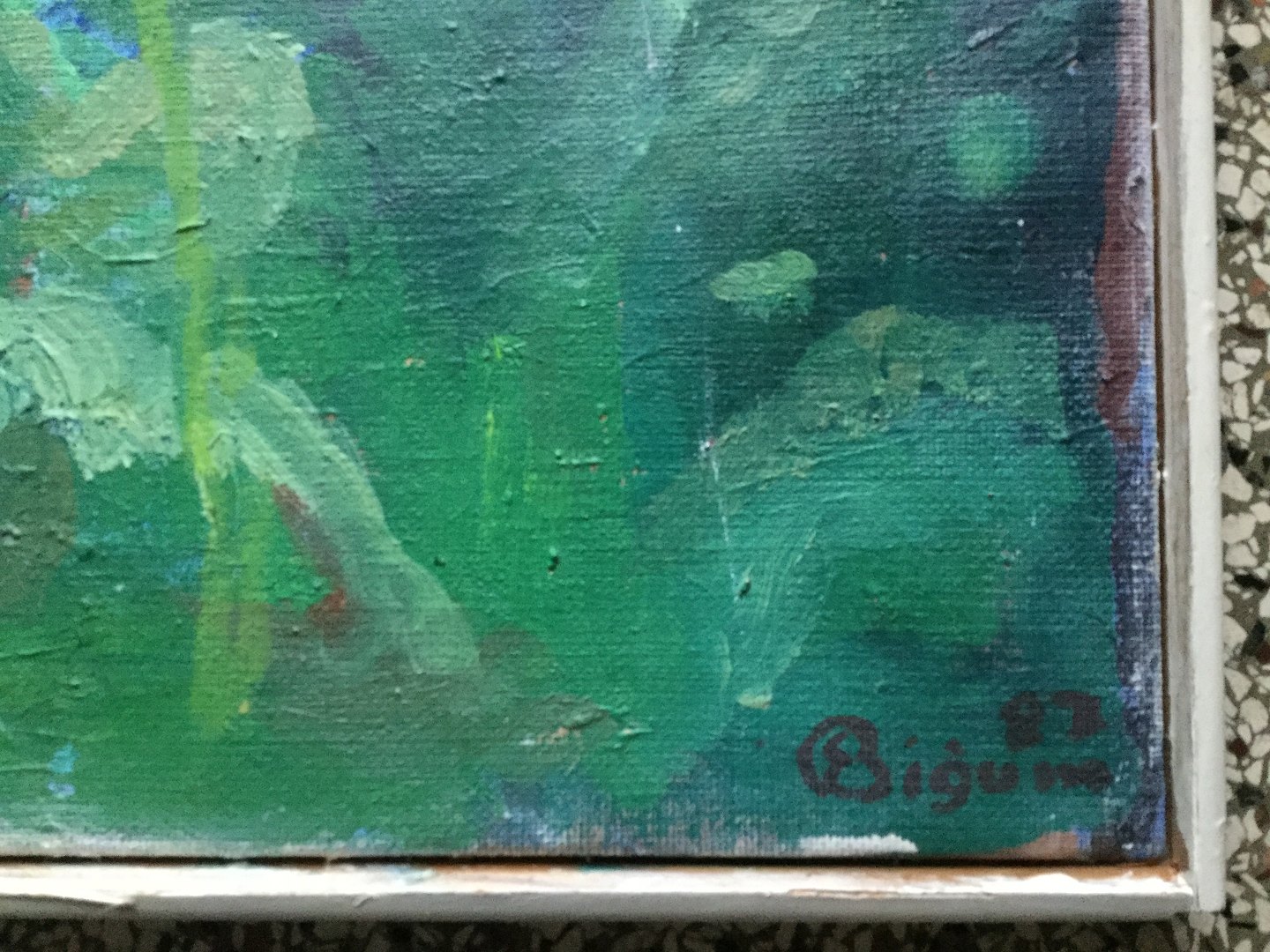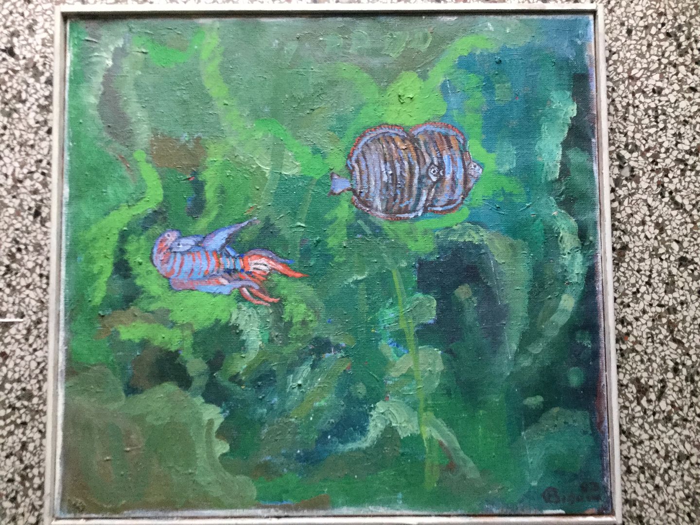 Maleri af Claus Bigum 1987 - Komposition med tang, fisk og skaldyr.