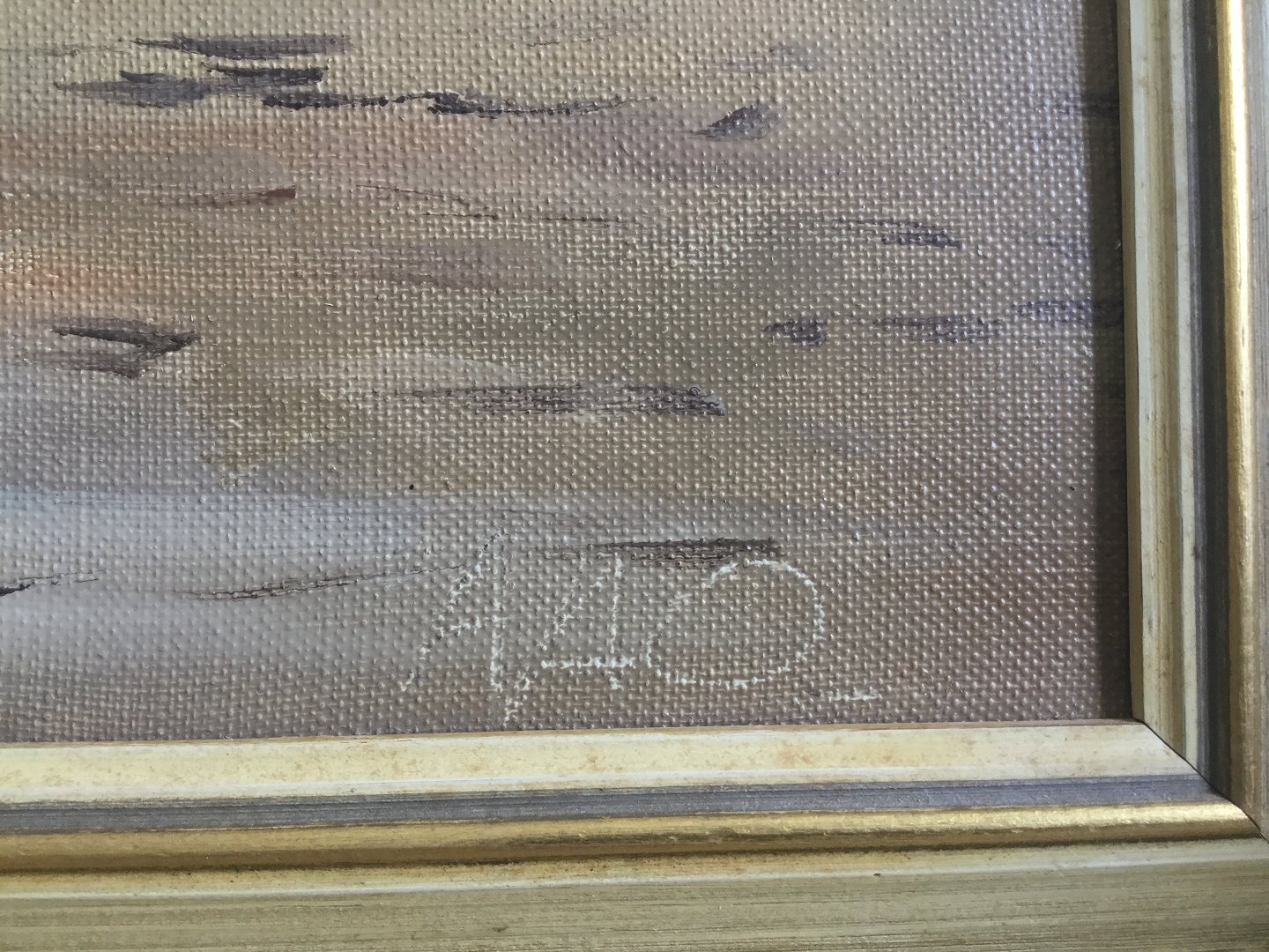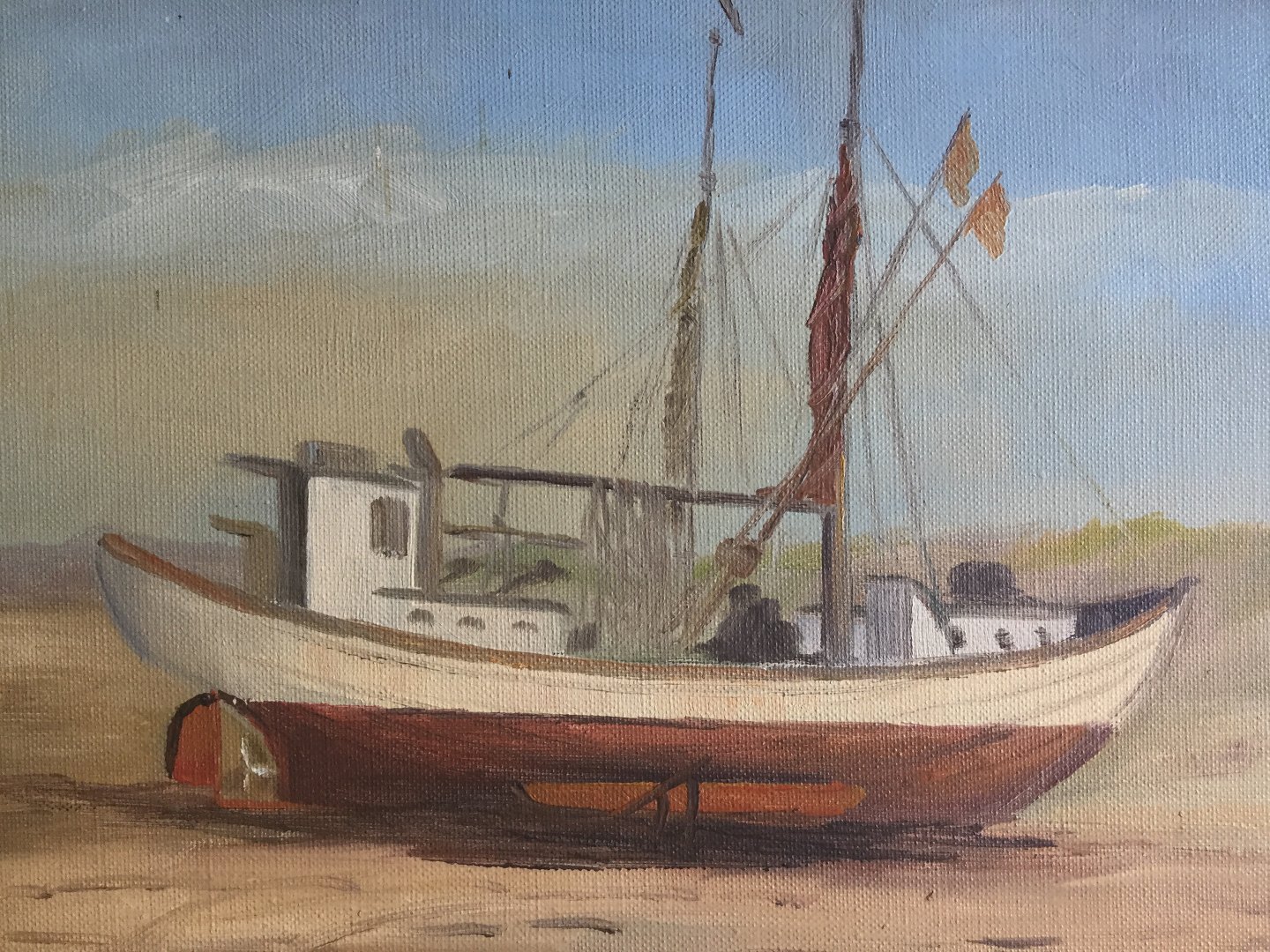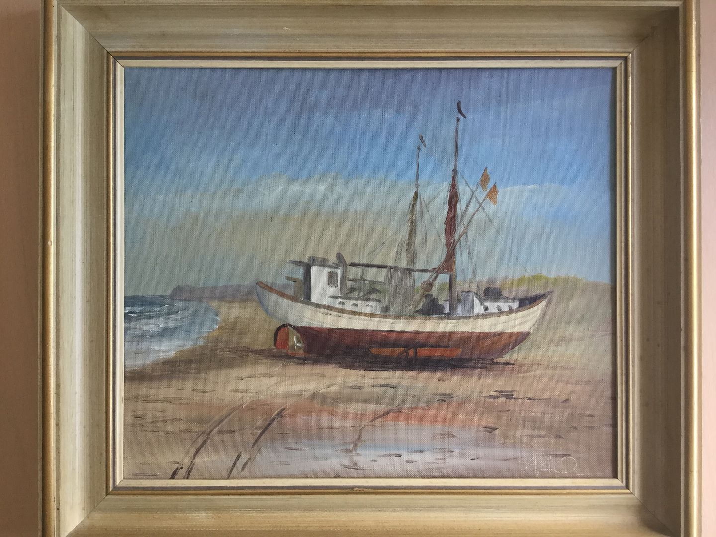 Maleri af Aage Oredsen - Fiskekutter på strand.