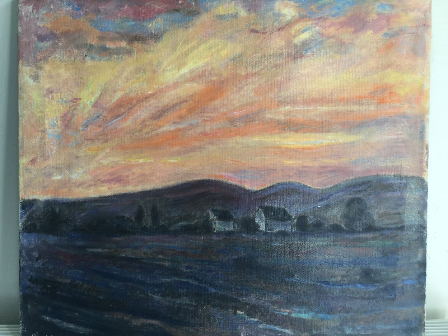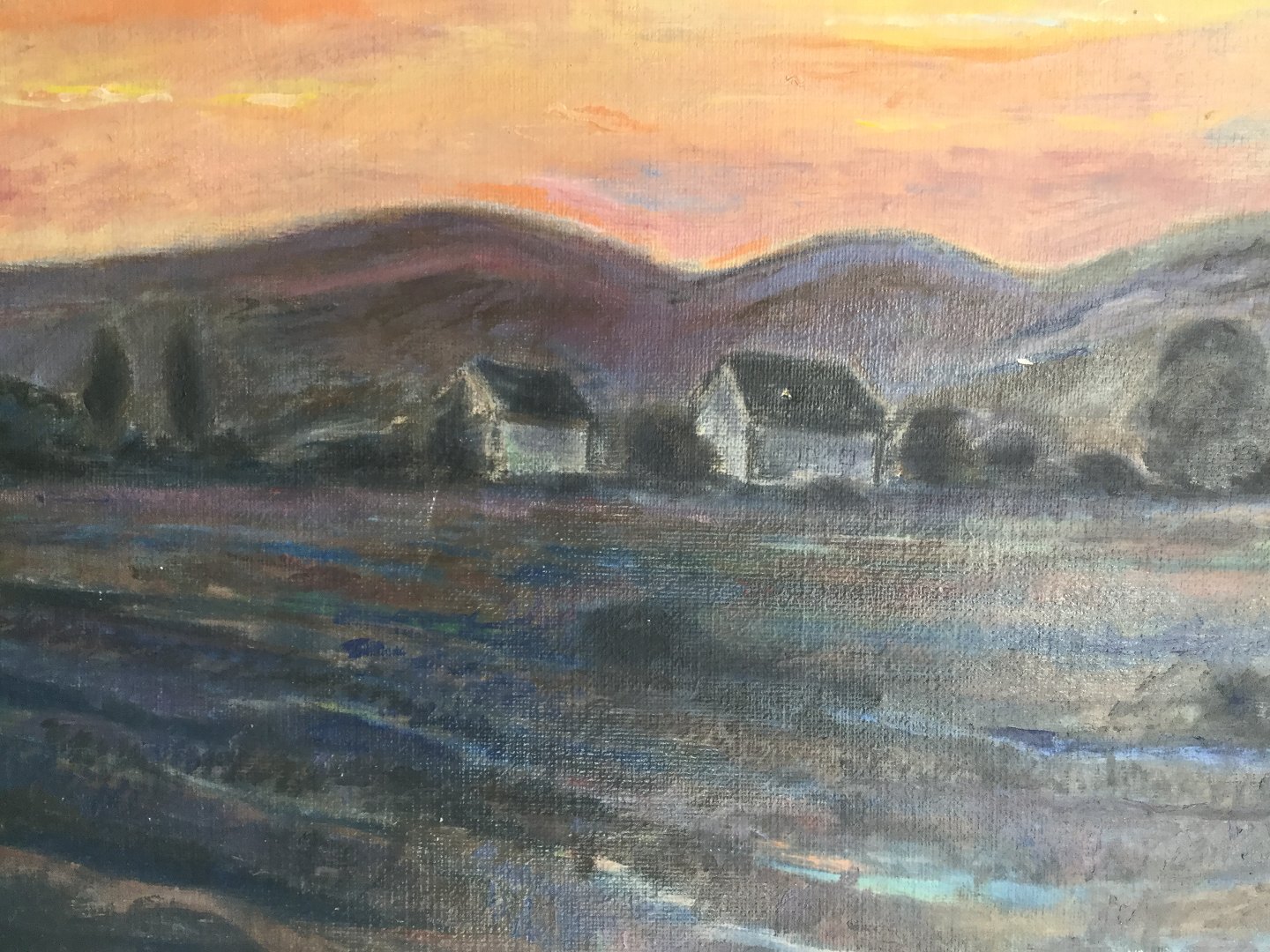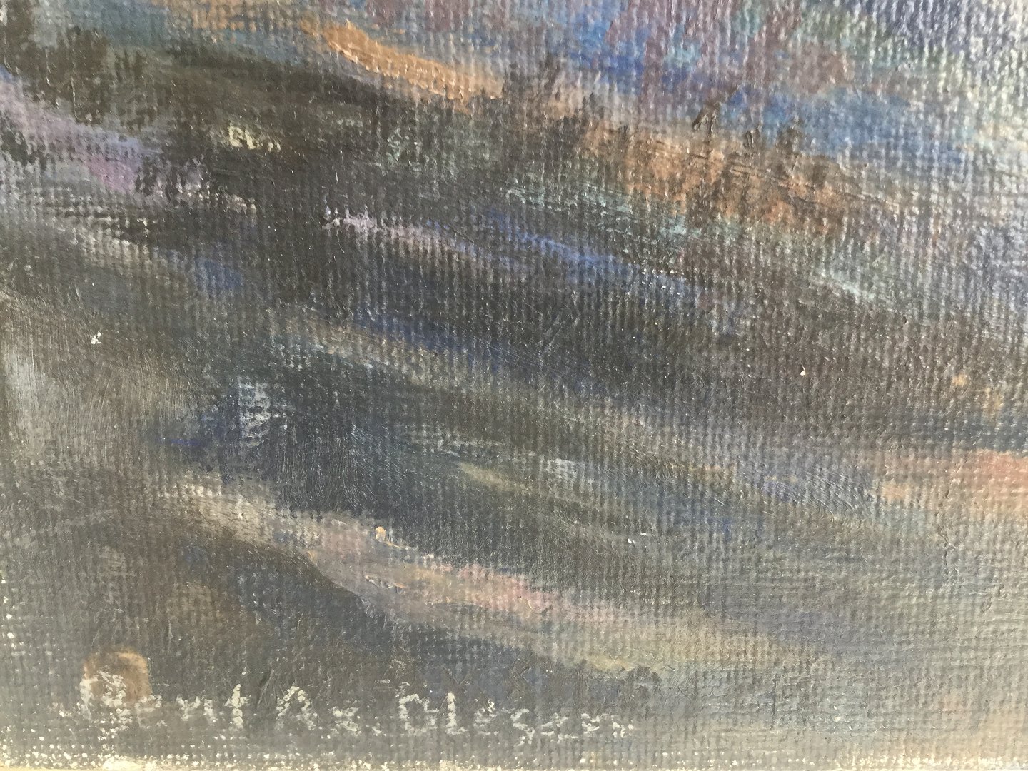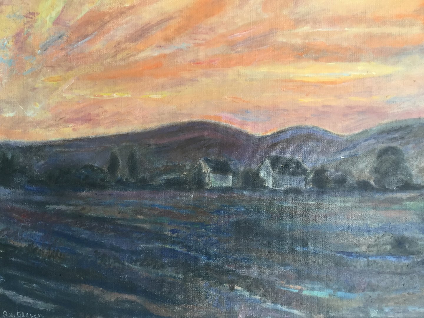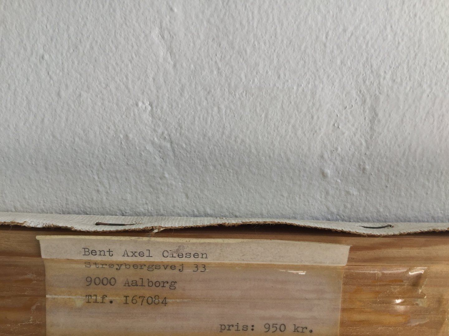 Text zugänglich auf Dänische: Maleri af Bent Axel Olesen - Huse ved solnedgang 1977.