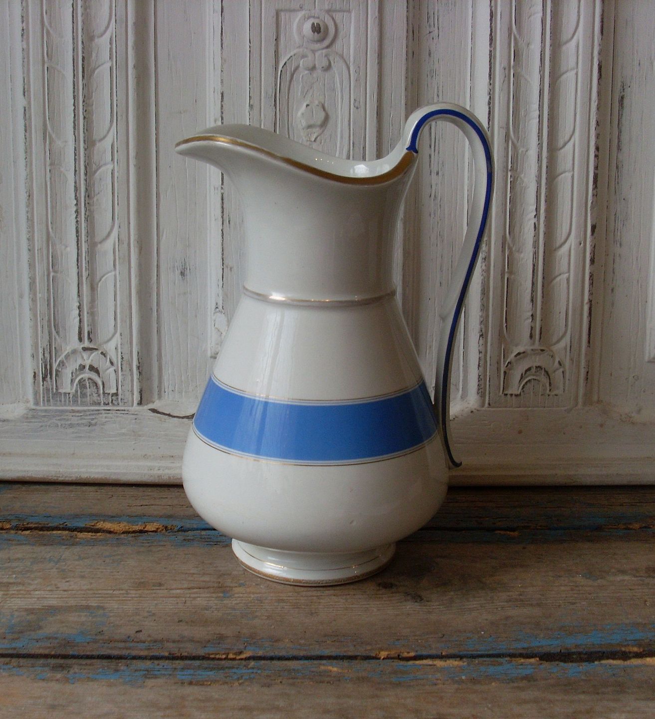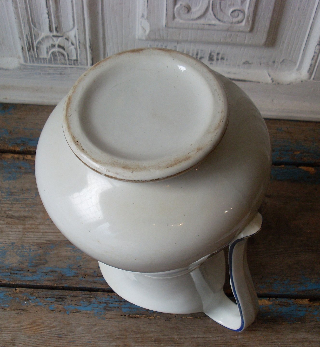 Smuk Aluminia kande dekoreret med blåt og guld, ca. år 1875.