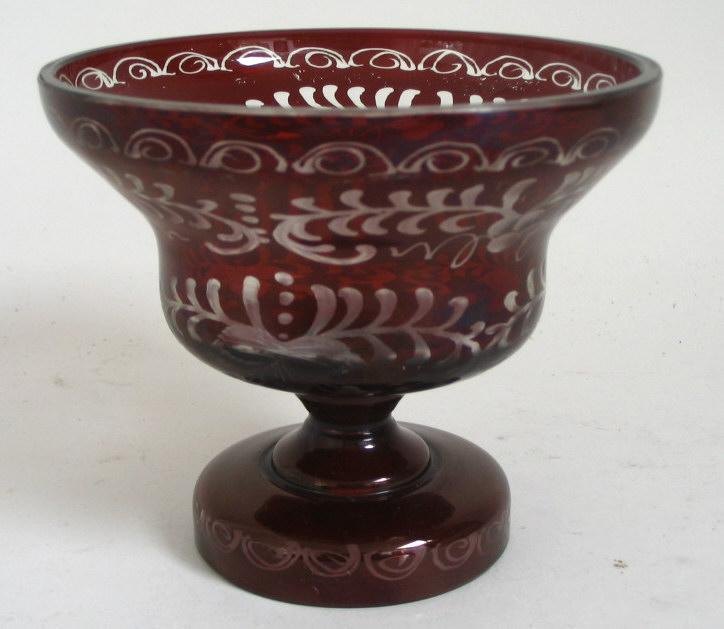 Böhmisk skål, 19. årh. med rødt overfang. Med slebet dekoration i form af blomster og frugter. H.: 11 cm. Dia.: 12,5 cm.