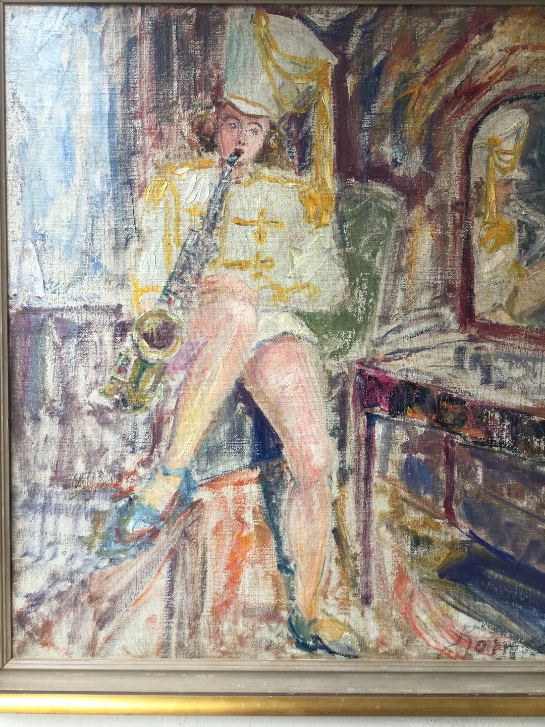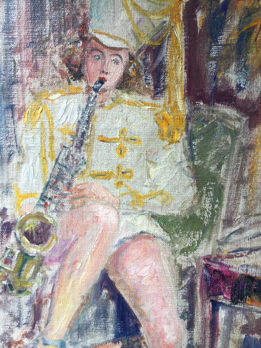 Pige i tamburmajorsuniform siddende i interiør, spillende på saxofon.