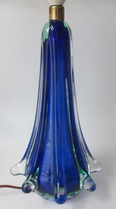 Bordlampe af blåt, grønt og klar glas, 1960'erne. Højde.: 32 cm. Med fatning: 53,5 cm.
