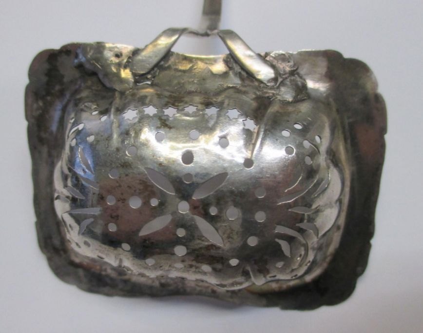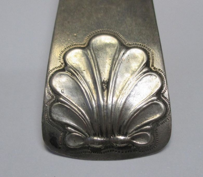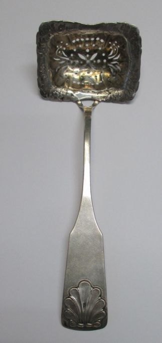 Strø ske i sølv, mester Hans Jessen Terkelsen (1822 - 1887) Ribe, Danmark. Muslinge mønster. Længde.: 16,5 cm. Stemplet med mester og bymærke.