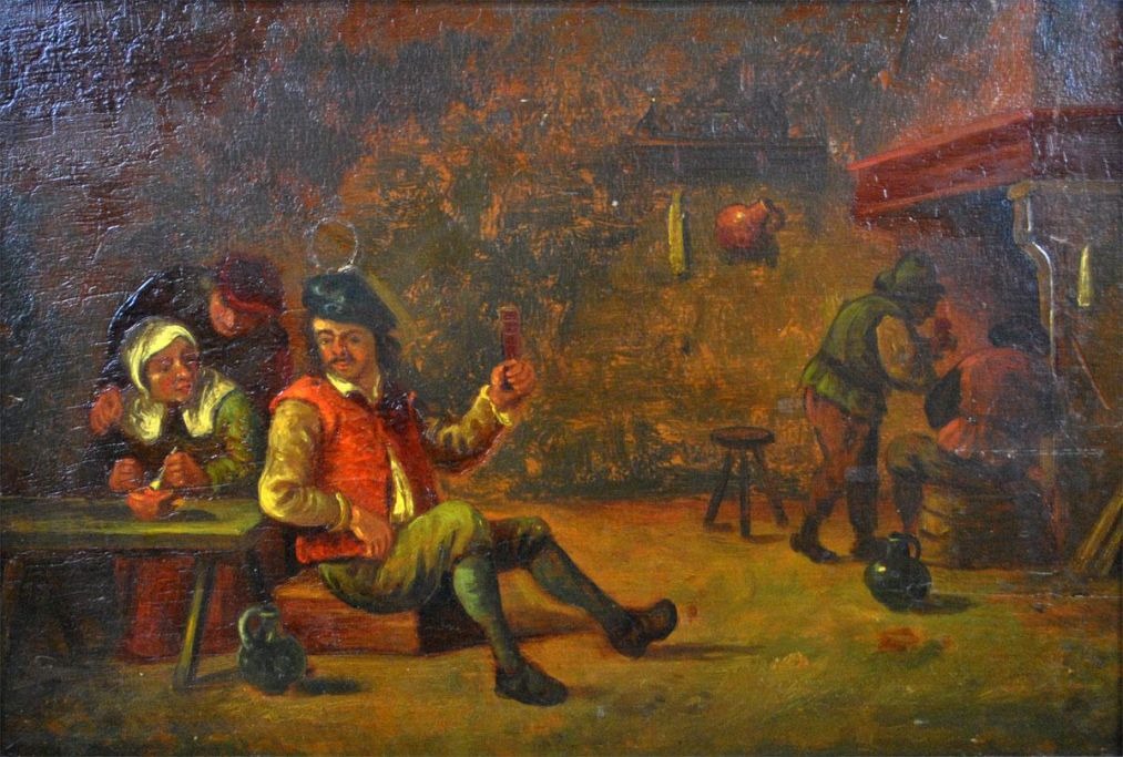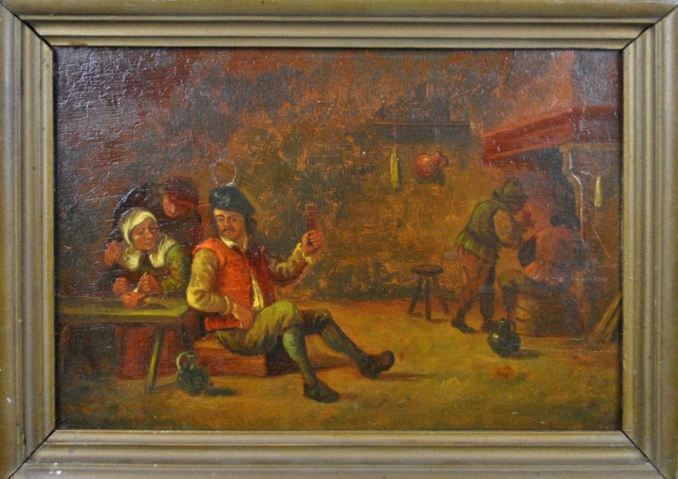 Ubekendt kunstner, 19 årh. Kro scene. Olie på ege panel. Usigneret. 23 x 33 cm.