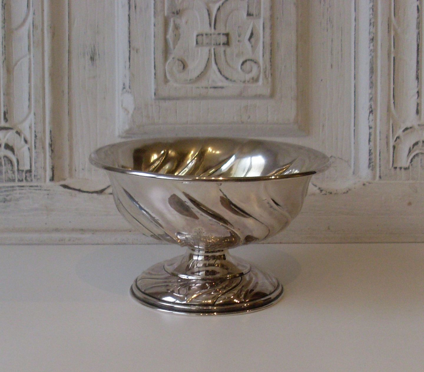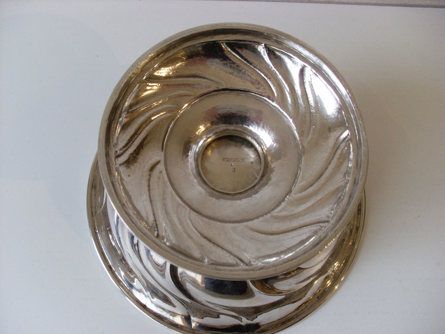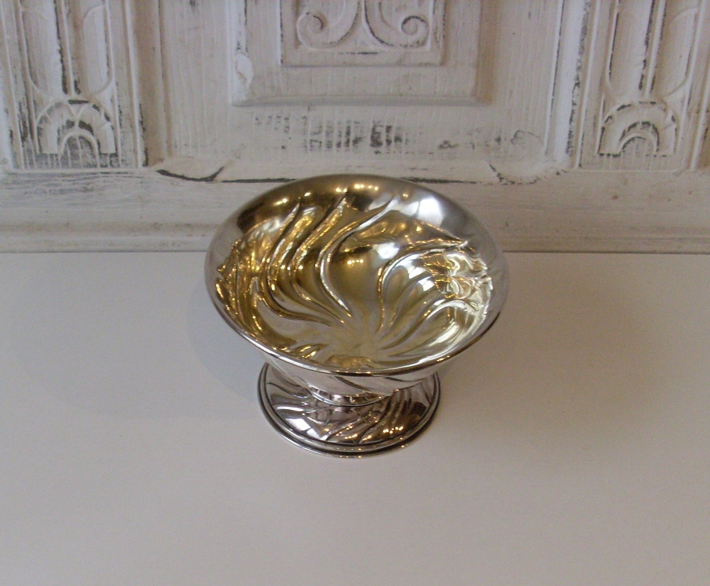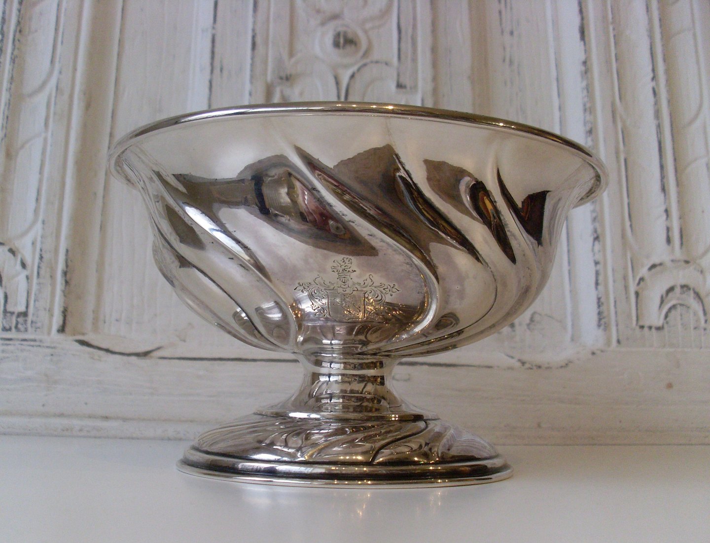 Norsk sølvskål på fod i rococo form, indvendigt forgyldt, prydet med våbenskjold.