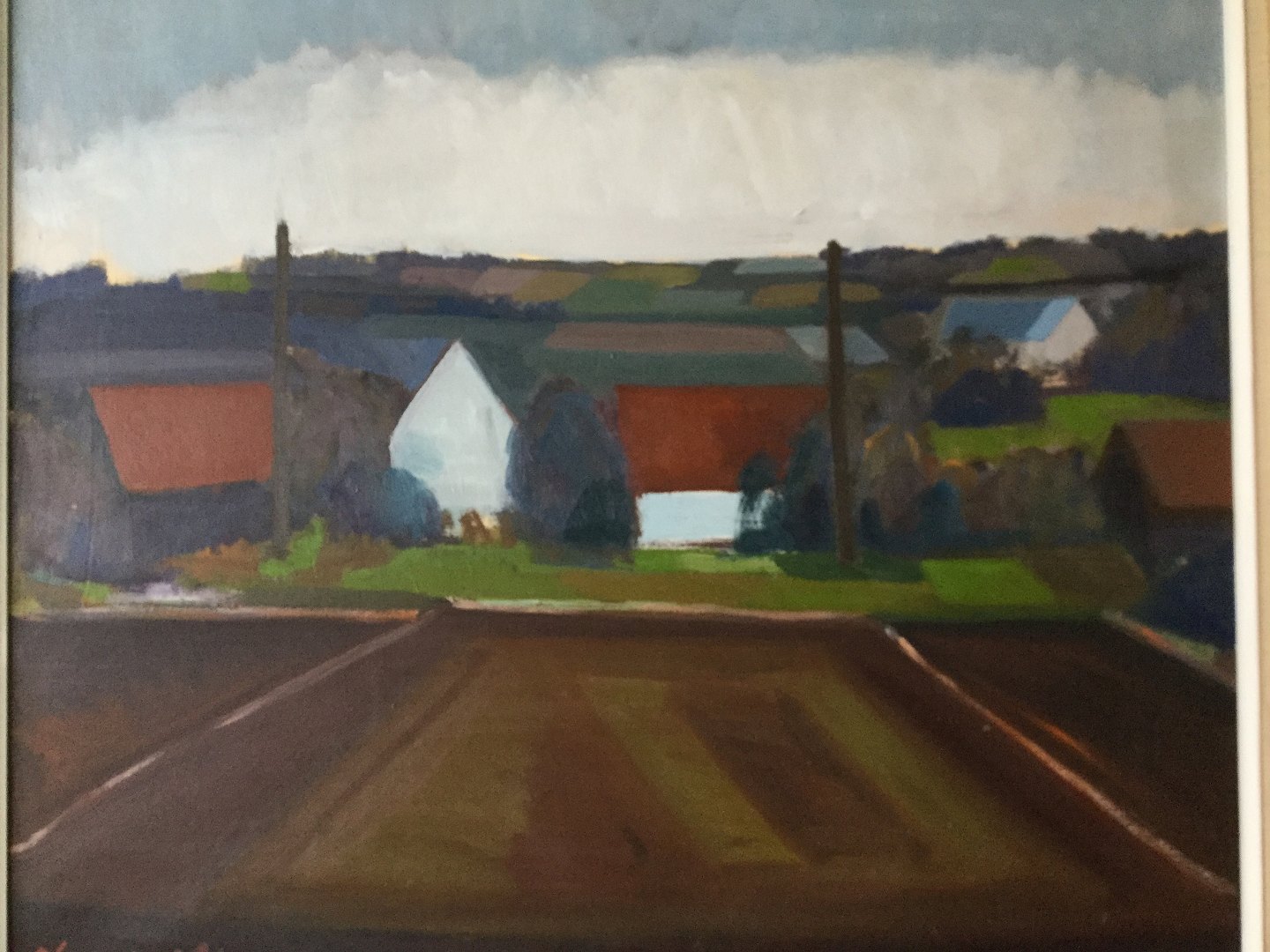 Maleri af Knud V. Olesen - Landskab med marker og gårde.