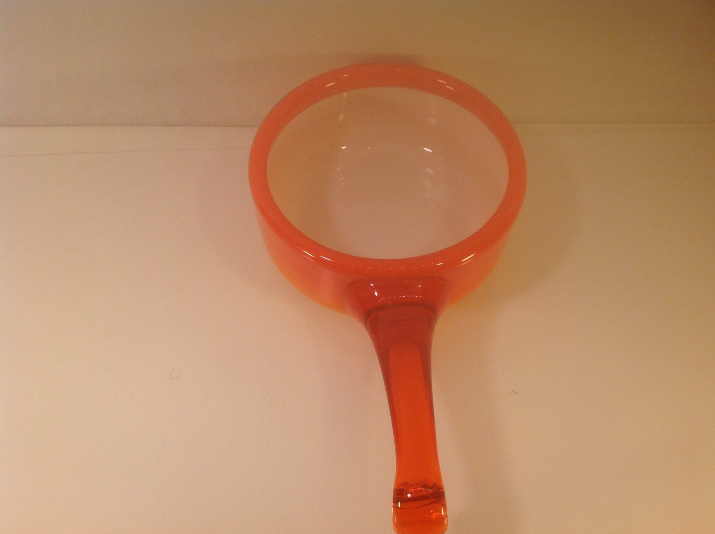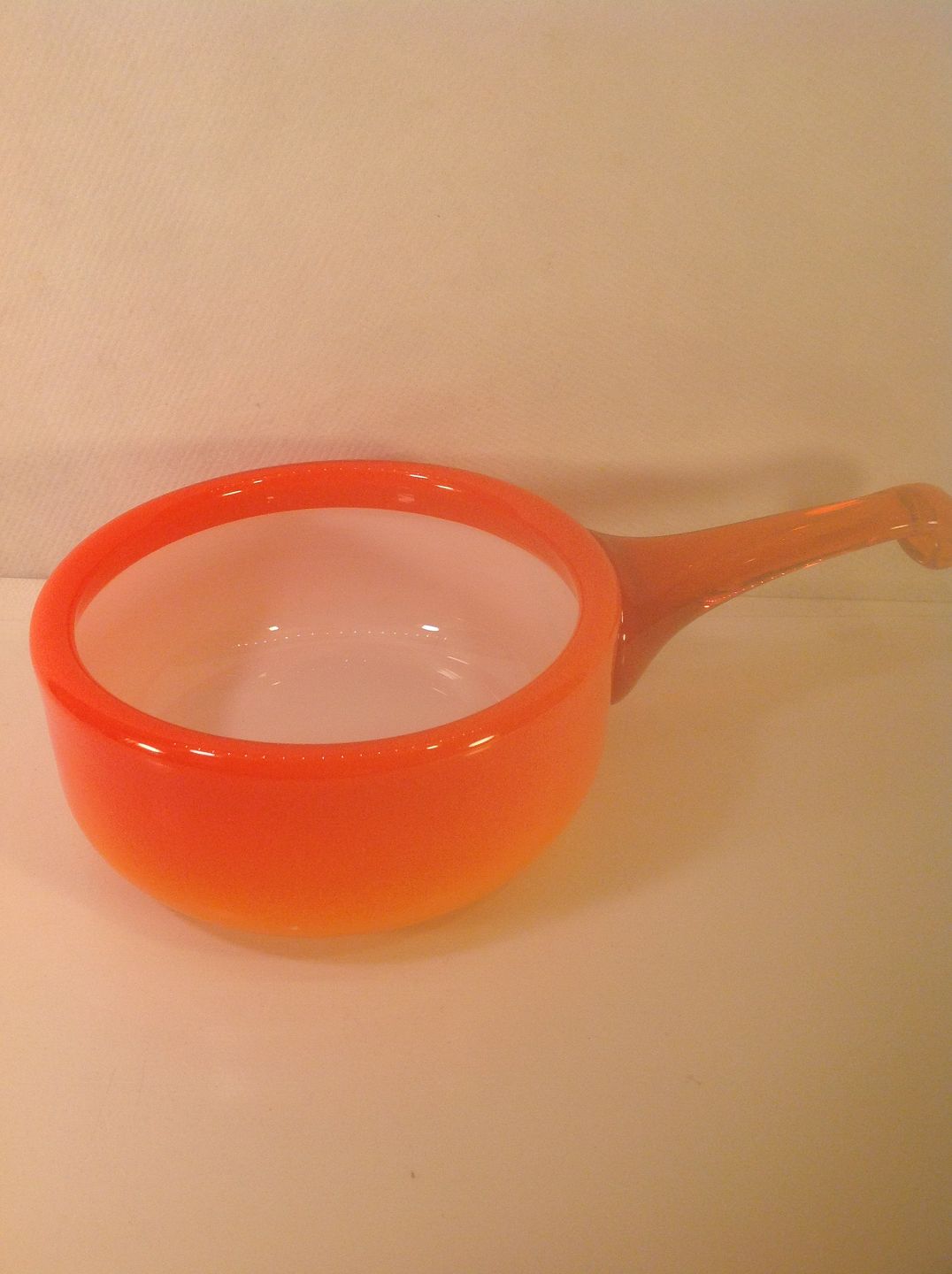 Skål med hank orange, dia. 12 cm, højde 5,5 cm.