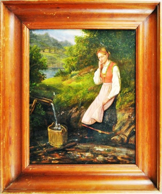 Norsk kunstner, 19. årh. En kvinde henter vand. Olie på pap. Usigneret. 38 x 31 cm.