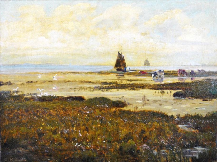 Xylander, Wilhelm (1840 - 1913) Danmark/Tyskland: Kystparti med både og køer