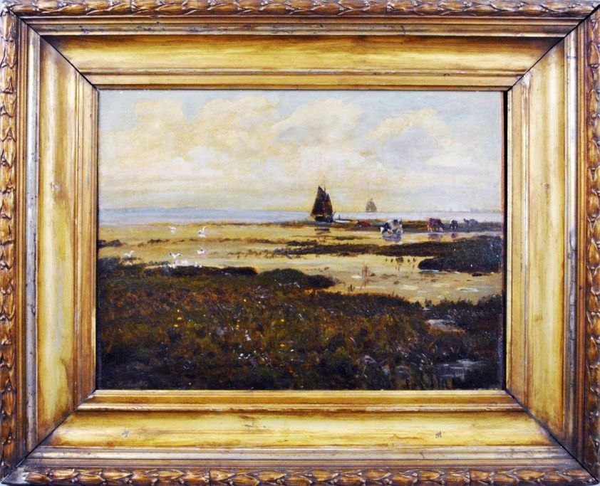 Xylander, Wilhelm (1840 - 1913) Danmark/Tyskland: Kystparti med både og køer. Olie på pap. Signeret: W.Xylander. 30 x 38 cm.
