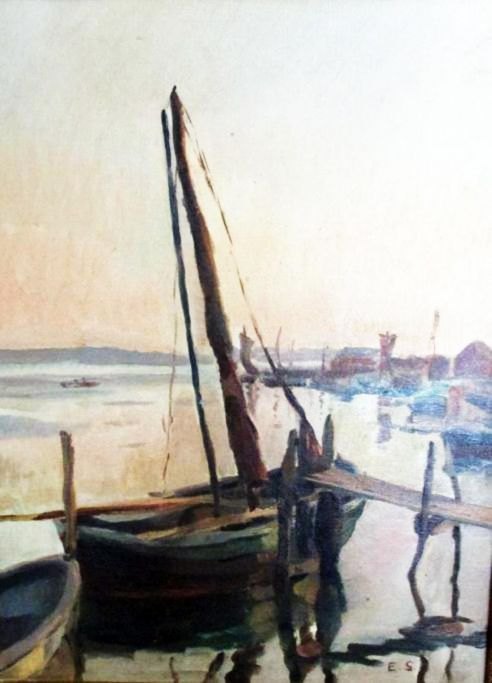 Sørensen, Eiler (1869 - 1953) Danmark: Havne parti. Olie på lærred. Signeret: E.S. 44 x 33 cm.