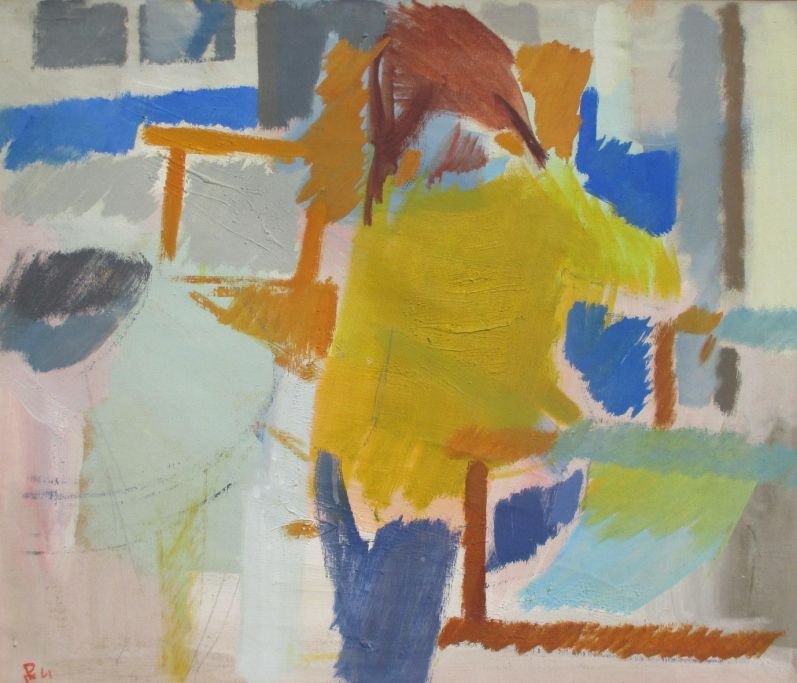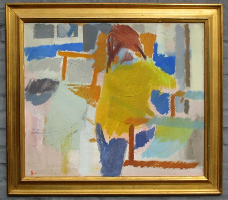 Nielsen, Poul (1920 - 1998) Danmark: En siddende pige ved et bord. Signeret: Monogram. 60 x 70 cm. Olie på lærred.