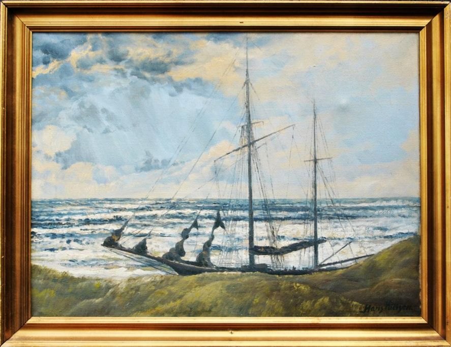Nielsen, Hans (20. årh) Danmark.: Stranding. Olie på lærred. Signeret: Hans Nielsen. 41 x 55 cm.