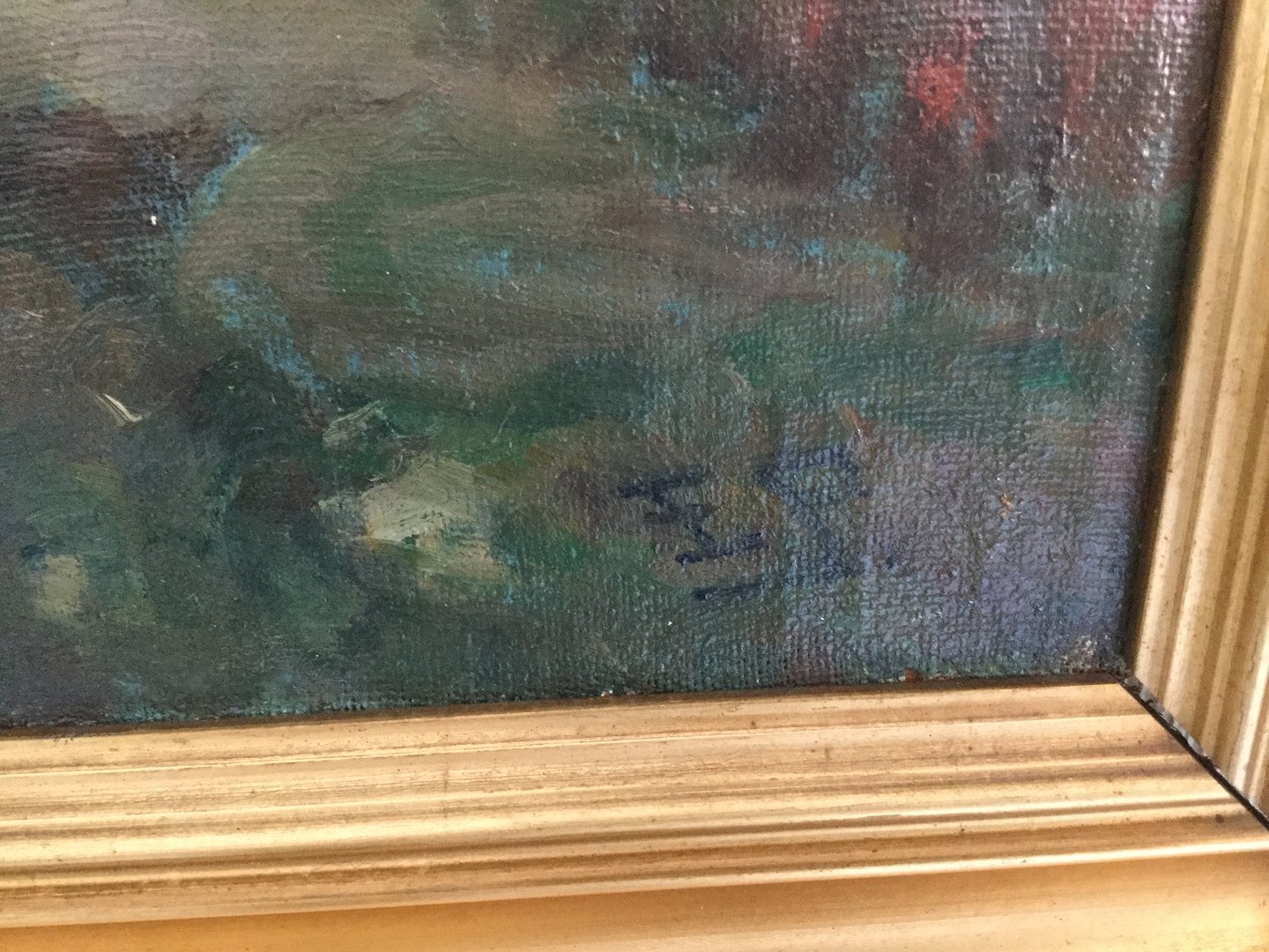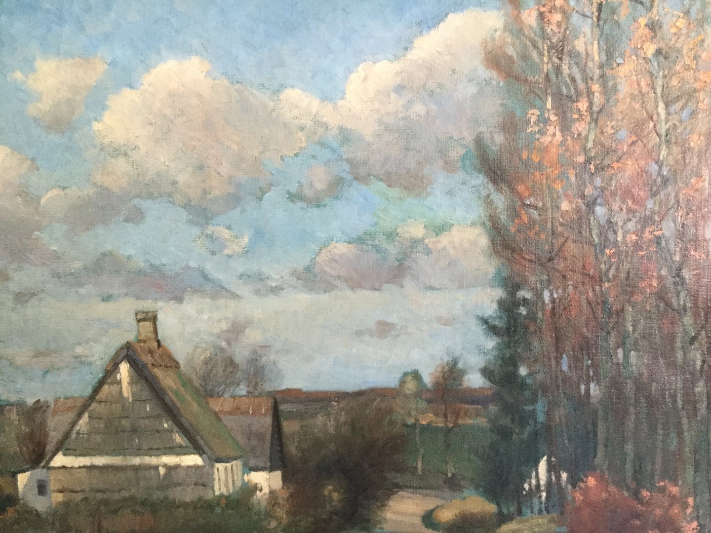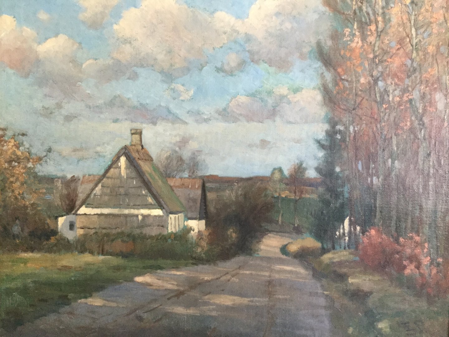 Maleri Edmund Petersen - Landskab med vej forbi gård.