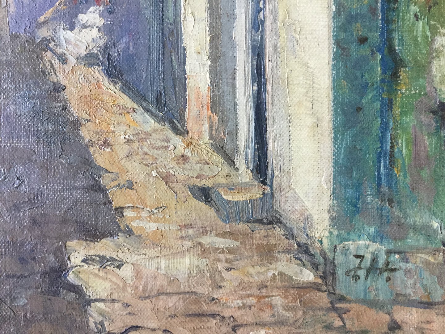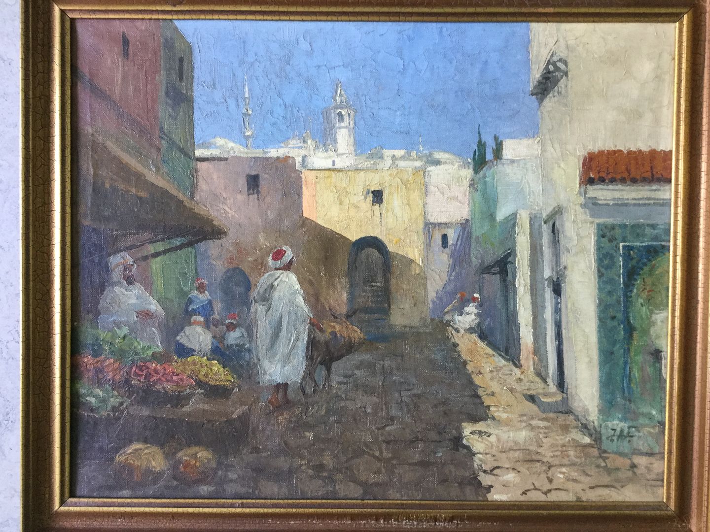 Maleri - Sydlandsk byparti med blomstermarked.
