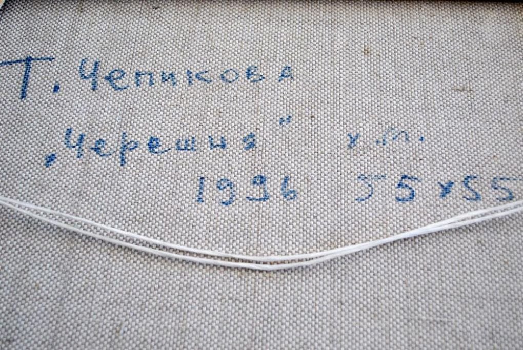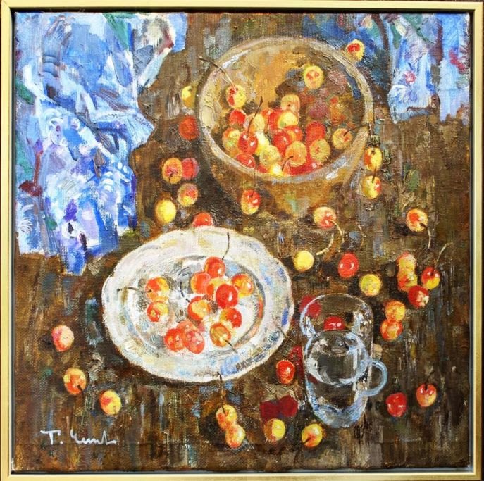 Chepikowa, Tatiana Alekseevna (1948 -) Rusland: Opstilling med moreller. Olie på lærred. Signeret 1996.