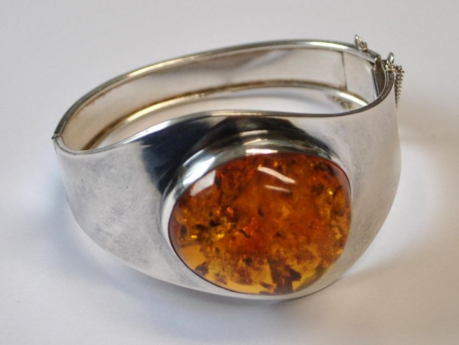 Sterling armbånd med poleret ravstykke med frø, 20. årh. Stemplet. Med lås. Indvendig mål: 6,5 x 5,2 cm. Vægt.: 40,1 gram.