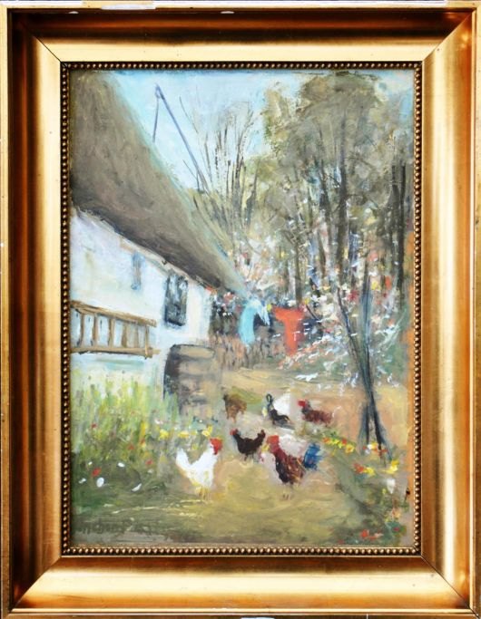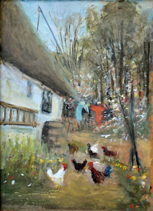 Dansk kunstner (20. årh.): Høns ved et hus.