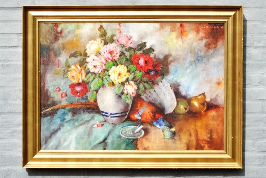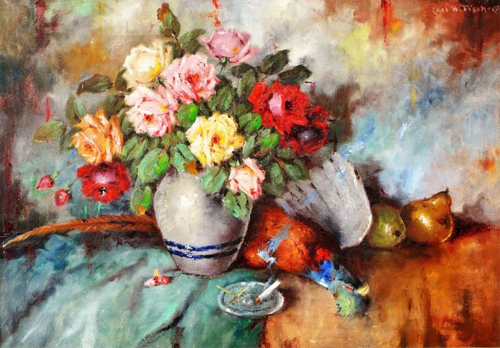 Fischer, Carl H. (1885 - 1955) Danmark. Opstilling med roser i en stentøjskrukke, en fasan, to pærer og en cigaret i et askebæger. Olie på lærred. Sign.: Carl H. Fischer. 68 x 99 cm.