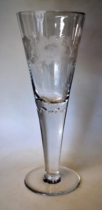 Glas pokal, ca. 1910 med slebne blomstermotiver. Med luftbobler i fod. Højde.: 28 cm.