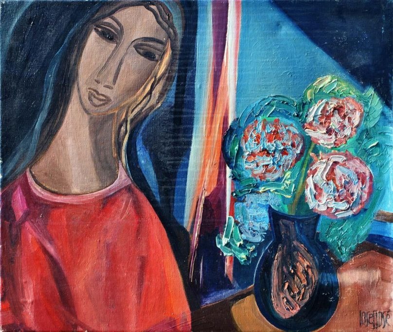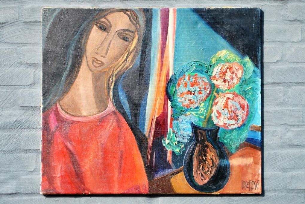 José, Josef (20. årh.): En ung kvinde med en buket på et bord. Olie på lærred. Sign.: Josef José. 60 x 72 cm.