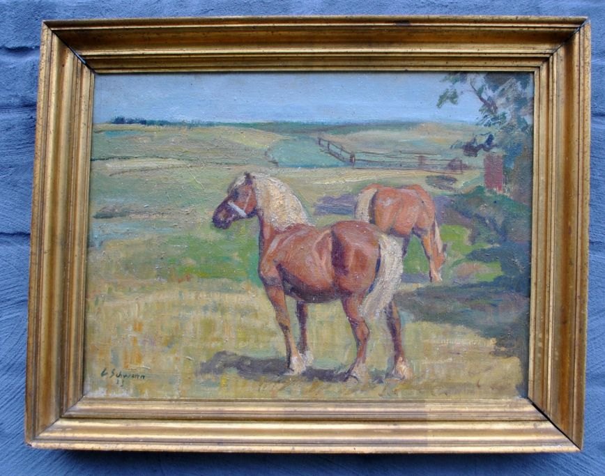 Schwenn, Carl (1888 - 1973): Heste på en mark. Ved Borup. Olie på lærred. Signeret: C. Schwenn 23. 33 x 44 cm.