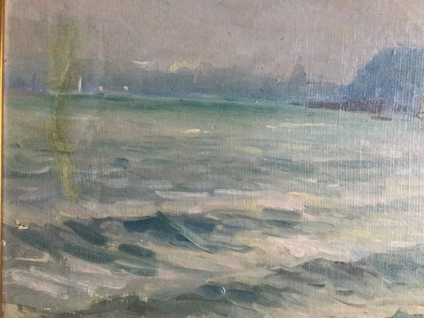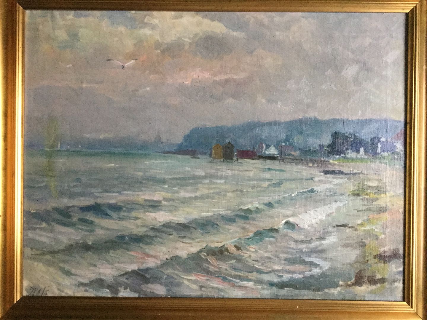 Maleri af Einar Gross - Kystparti med by i baggrunden.