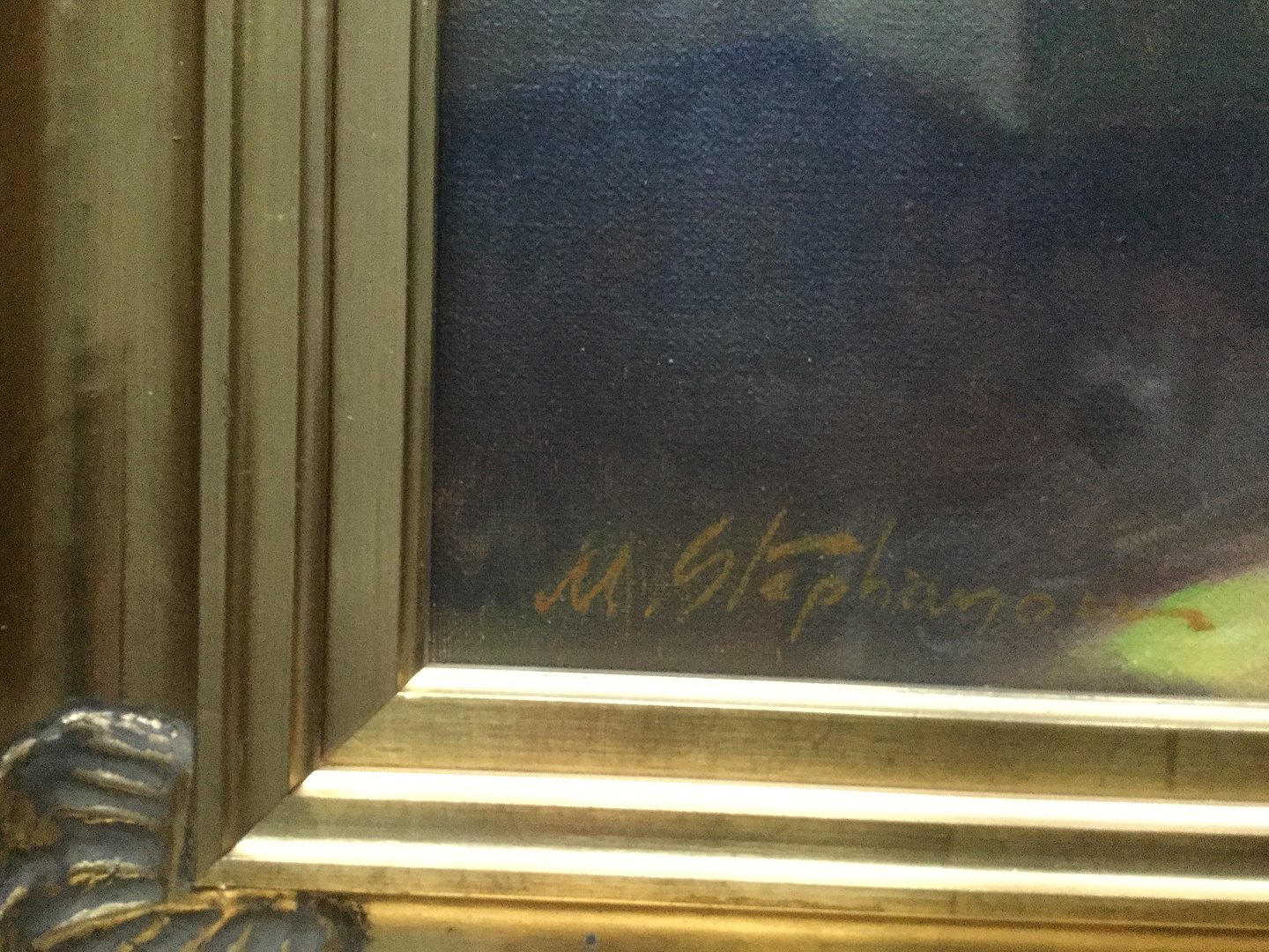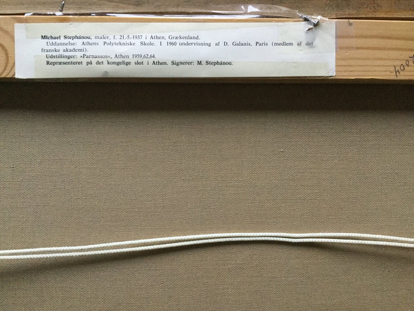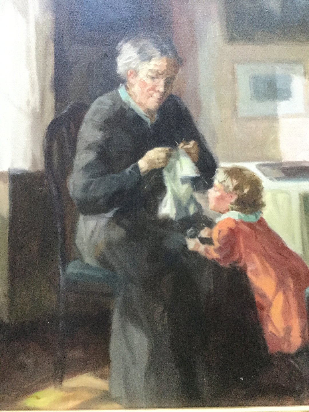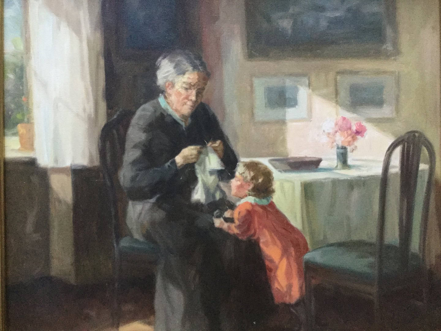 Maleri af Michael Stephánou - Interiør med strikkende kvinde og barn.