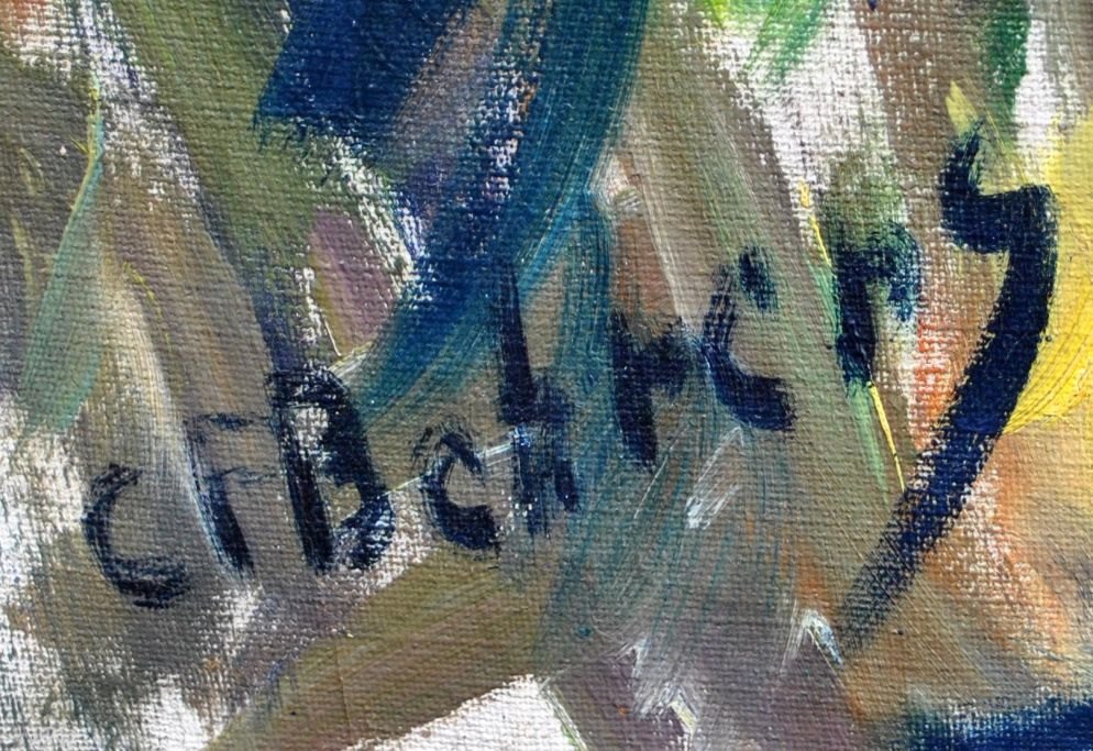 Behrens, C. F. (1902 - ?) Danmark: En kvinde i en skov. Olie på lærred. Signeret. 64 x 62 cm.