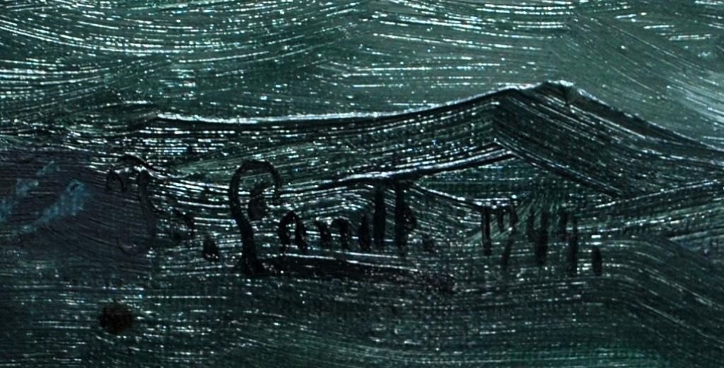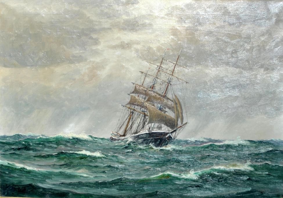 Landt, Frants (1885 - 1975) Danmark: Marine med sejlskib. Olie på lærred. Signeret: Fr. Landt 1949. 56 x 80 cm.