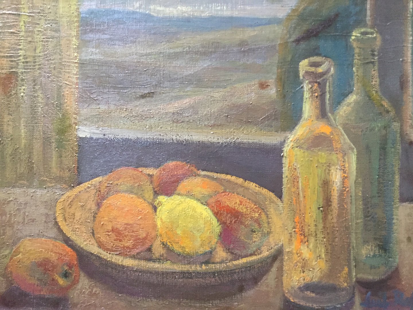 Maleri af Leif Rafn - Opstilling ved vindue med flasker og frugt .