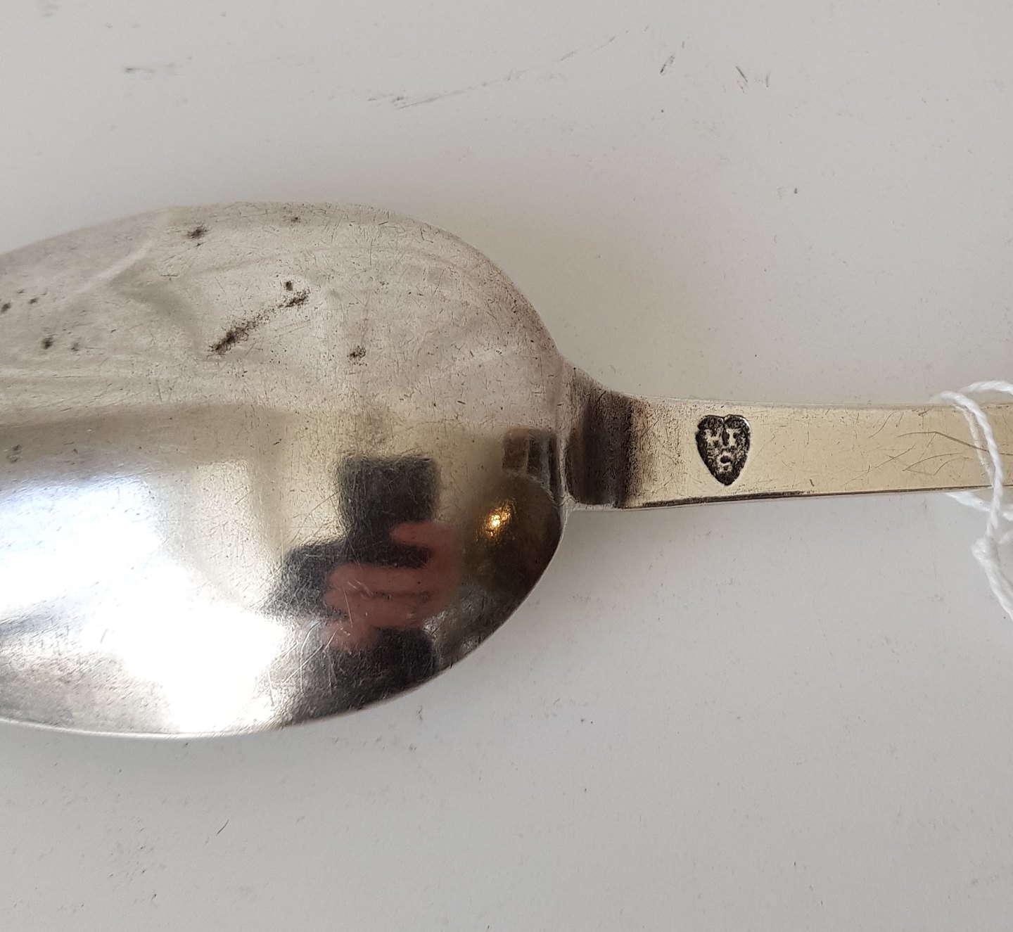 Barok spiseske i sølv 1700tallets 2. halvdel. Stempel HFS i hjerte, er lavet af Hinrich Friedrich Schrøder, Meldorf. Gift 1763 og 1794 i Glückstadt. Død 1802 i Meldorf