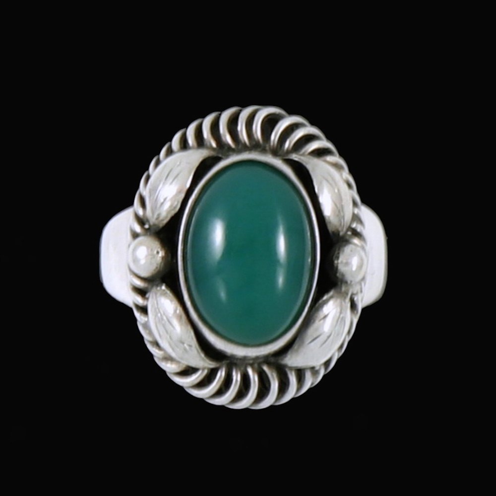 Text zugänglich auf Dänische: Leif Ulrich Daurup. Ring i Sterling Sølv med grøn agat.