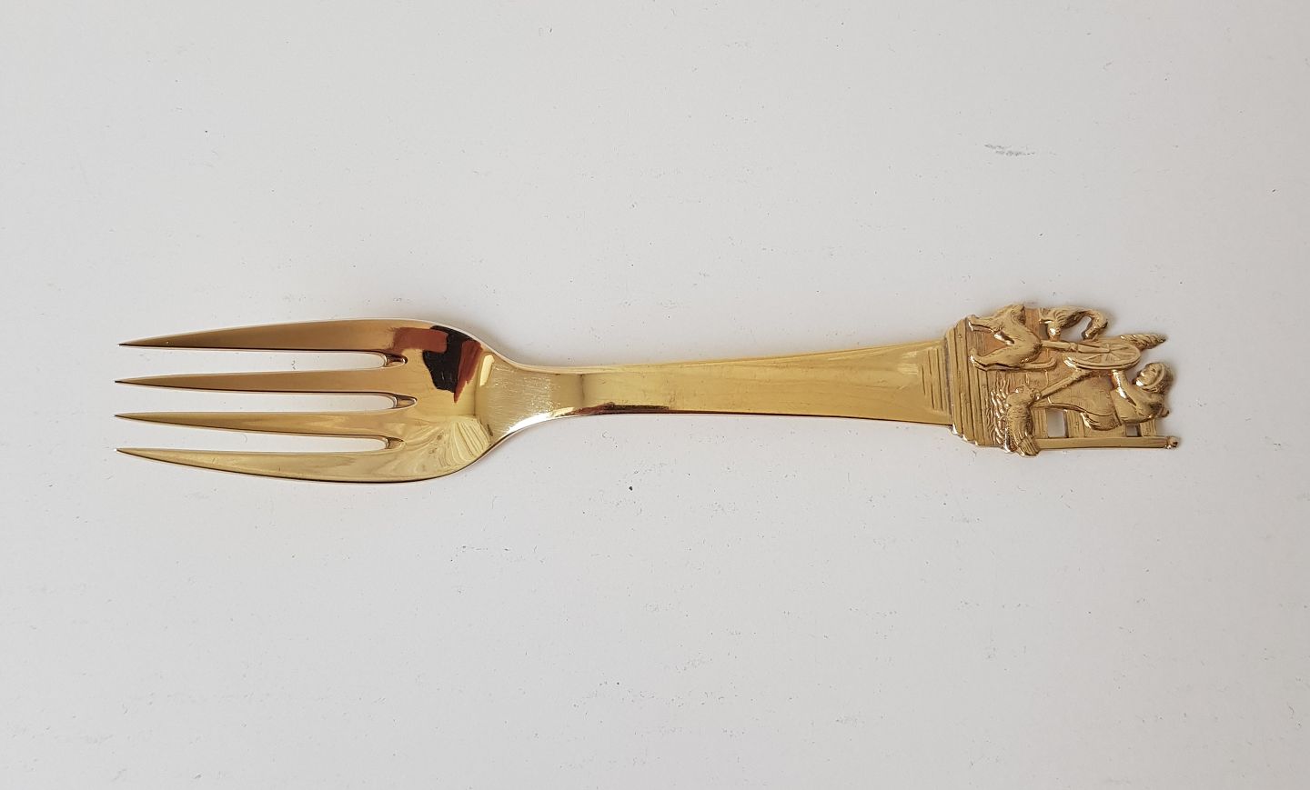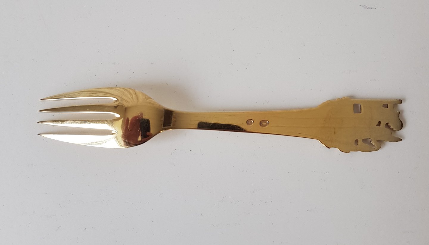 H.C. Andersen eventyrgaffel i forgyldt sølv - motiv "Spinderokken"