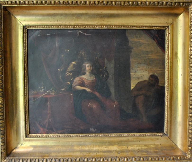 Portræt af en dronning siddende på trone ved siden af et bord, hvor regalierne er lagt frem på rød dug, olie på kobberplade, usign. 25 x 32,5 cm.