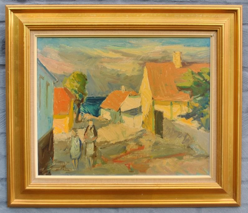 Nielsen, Svend (1908 - 1993) Danmark: Scene fra Svaneke, Bornholm. Olie på lærred. Signeret. 42 x 52 cm.